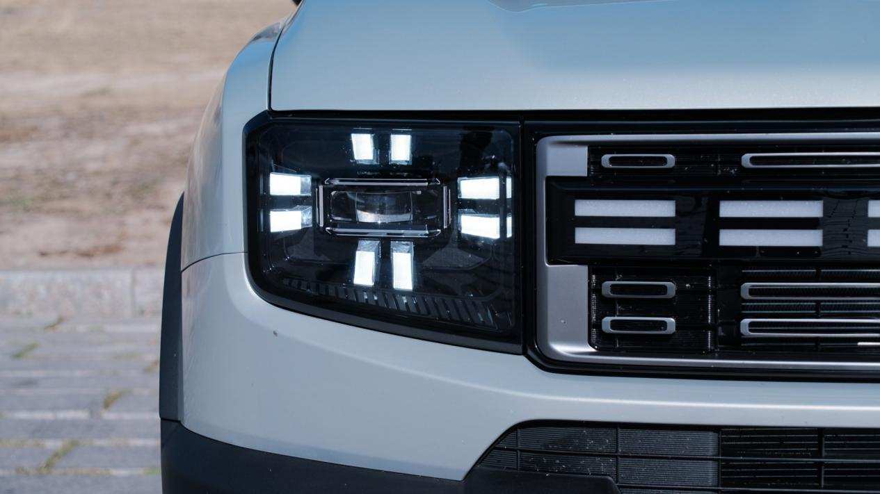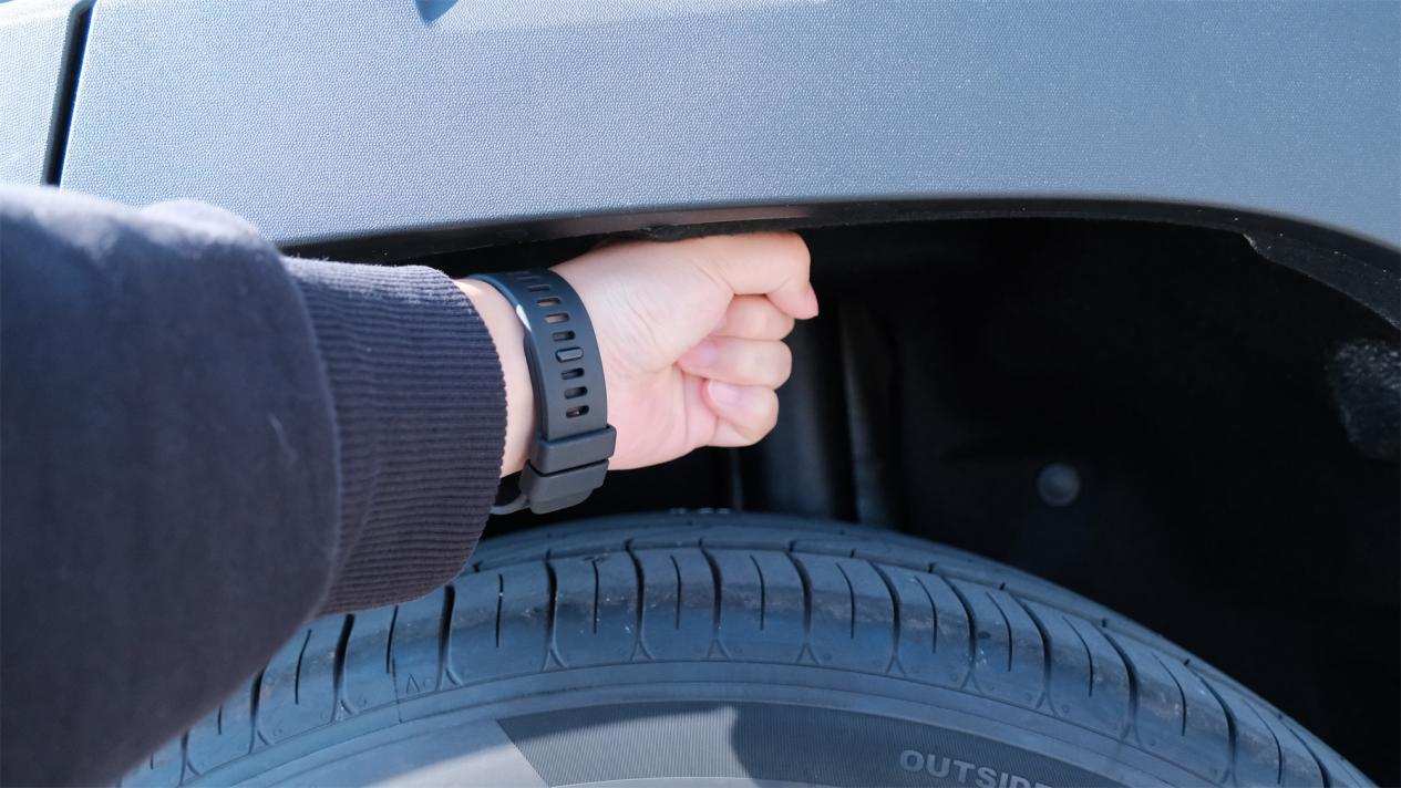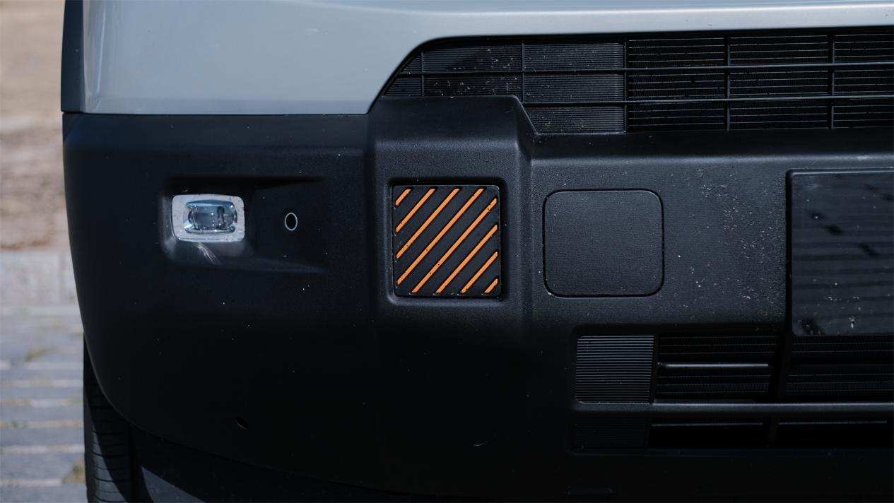 雾灯旁又黑又厚的前保险杠上还有黄色斜纹警示线,增添了一丝越野车的属性。