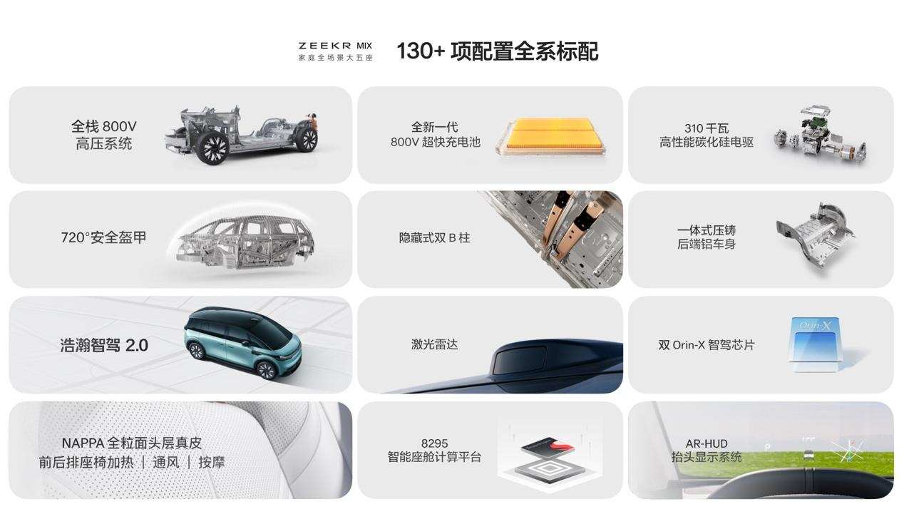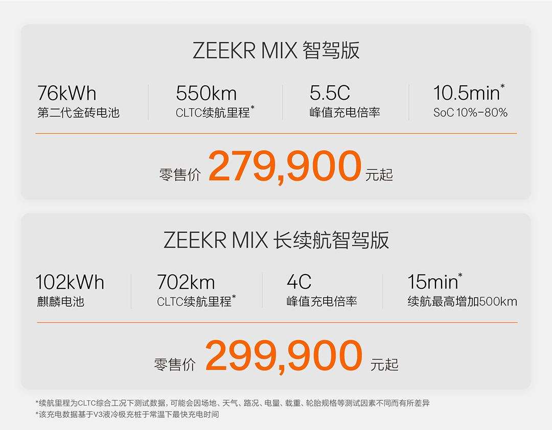 先说大家最关心的价格和权益。本次极氪MIX共发布了两款车型,选择维度只有一维——即是电池大小:智驾版(27.99万元起)配76kWh第二代金砖电池(CLTC续航里程550km);长续航智驾版(29.99万元起)配102kWh麒麟电池(CLTC续航里程702km),其他130多项配置皆是标配,包括智舱、智驾和舒适性配置等。