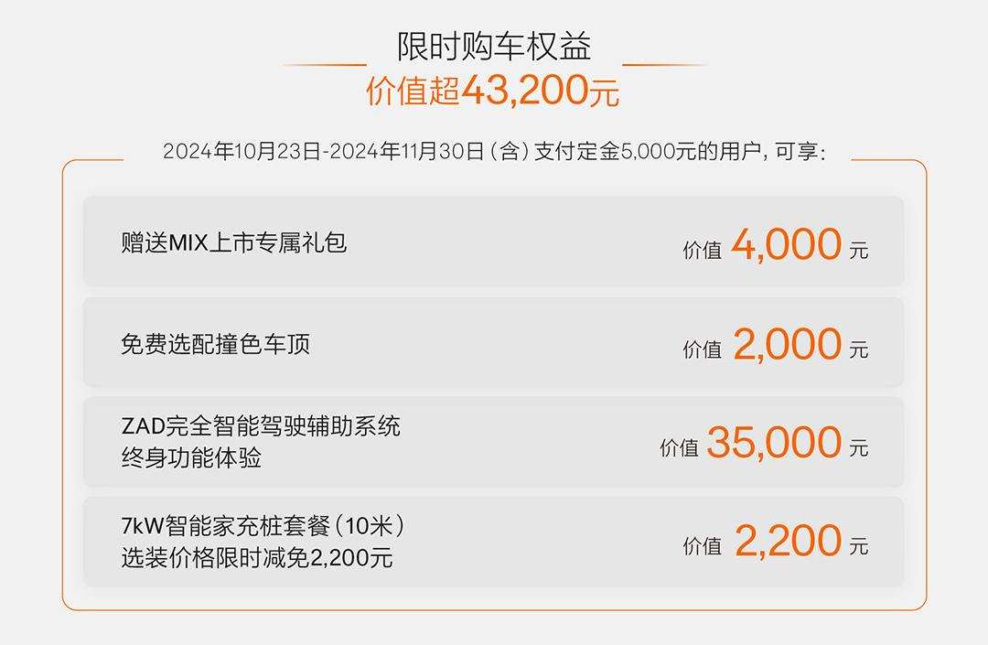 而权益方面,即日起至2024年11月30日(含),所有下定用户,可享至高超4万元限时购车权益,包括:赠送价值4000元的专属礼包(大桌板、小桌板、拓展杯架);免费选装价值2000元的撞色车顶;价值3.5万元的ZAD完全智能驾驶辅助系统终身功能体验;可减免2200元选装7kW智能家充桩套餐(10米);以及终身免费三电质保、终身免费数据流量等各项权益。