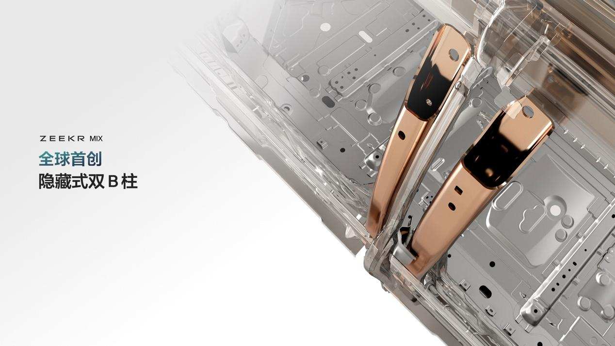 首先,当然要重点聊一下,必然是极氪为使空间极大化所独创的『隐藏式双B柱设计』。我们要注意的是,B柱是被隐藏,而不是没有。其实在每侧车门内,都安装有两根直径约70mm的一体成型热气胀钢柱,两侧合计安装四根。