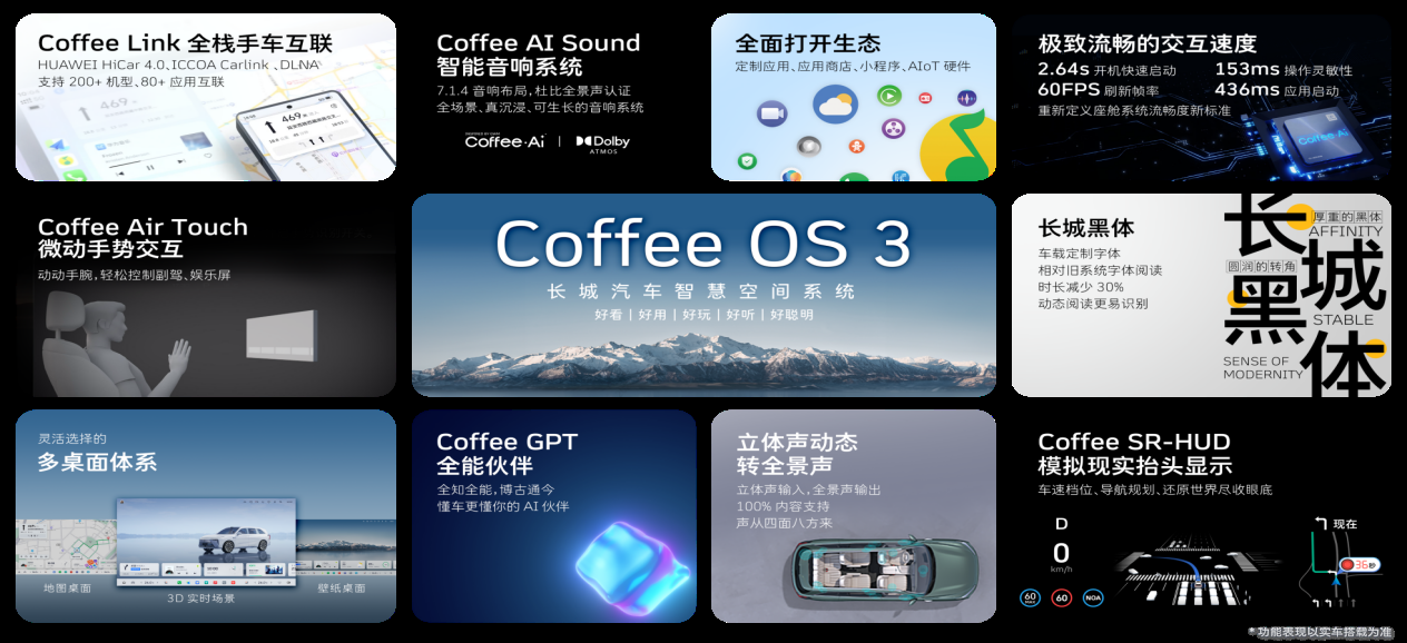 长城汽车的智能化布局可追溯到2011年,魏建军透露,长城汽车有10多个有智能化的研发团队,研发人员有6000多,顶尖级的专家有600多。在此期间,长城汽车打造出了涵盖智慧空间、智能出行、EE架构、云平台、AI的全域智能化解决方案——咖啡智能(Coffee AI),其核心,就是消费者触达率最高的Coffee OS 3智慧空间系统。
