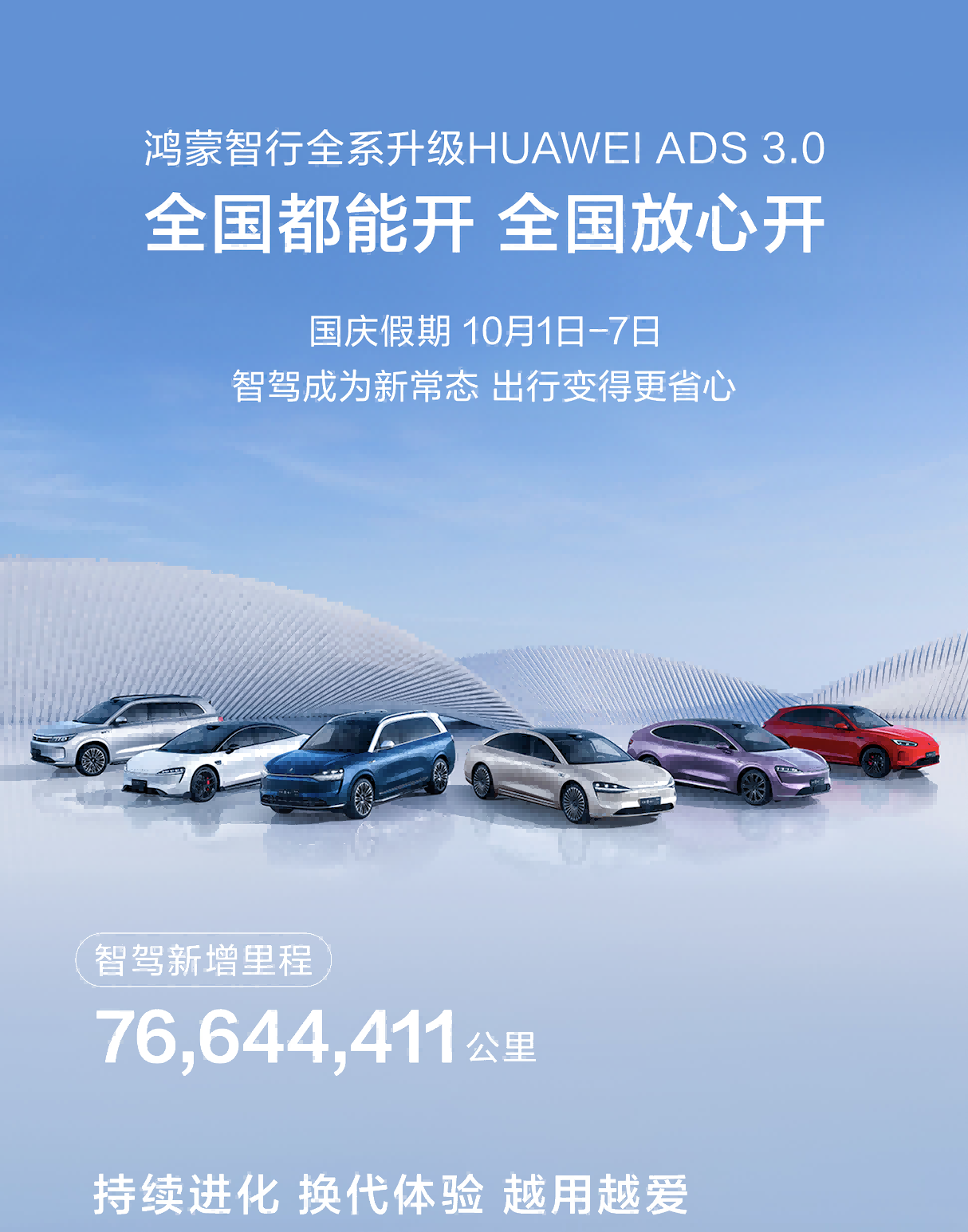 更难能可贵的是,鸿蒙智行强大的销量支撑,让更多的终端用户能体验到顶级智能汽车带来的人车生活,与此同时,呈现指数增长的驾驶数据,可以让智驾和座舱体验常用常新,从而带来更安全和极致的实际表现。鸿蒙智行智驾里程突破8.5亿公里,用户使用城区NCA总里程超2.1亿公里,2024国庆节期间,智驾里程新增7700万公里,智驾体验有口皆碑。鸿蒙智行通过HUAWEI ADS 3.0、鸿蒙座舱、途灵平台等核心技术,让操控性、舒适性和安全性实现了质的飞跃。并通过OTA不断升级,持续带来体验层面的增值,树立了行业新标杆。