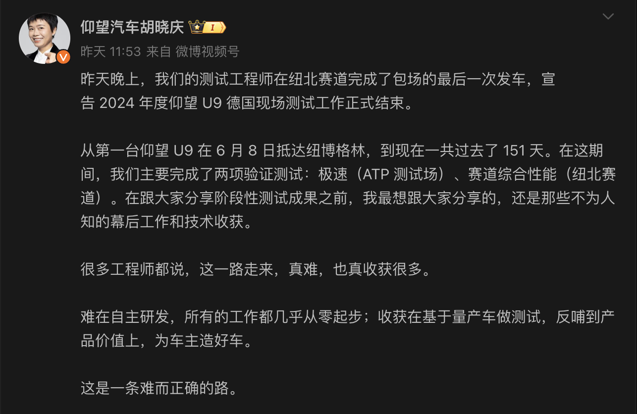 这也使得仰望U9这款由中国人全完自研的产品获得突破性成绩后,仰望销售事业部总经理胡晓庆女士也在微博上感叹了德国之旅的坎坷和收获。
