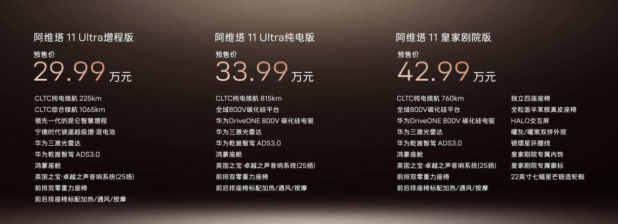 同时,阿维塔科技副总裁雍军表示:『随着阿维塔11增程版的预售,阿维塔将开启全系增程布局的新里程,阿维塔也将成为唯一一个全系提供增程和纯电双动力选择的高端品牌。』