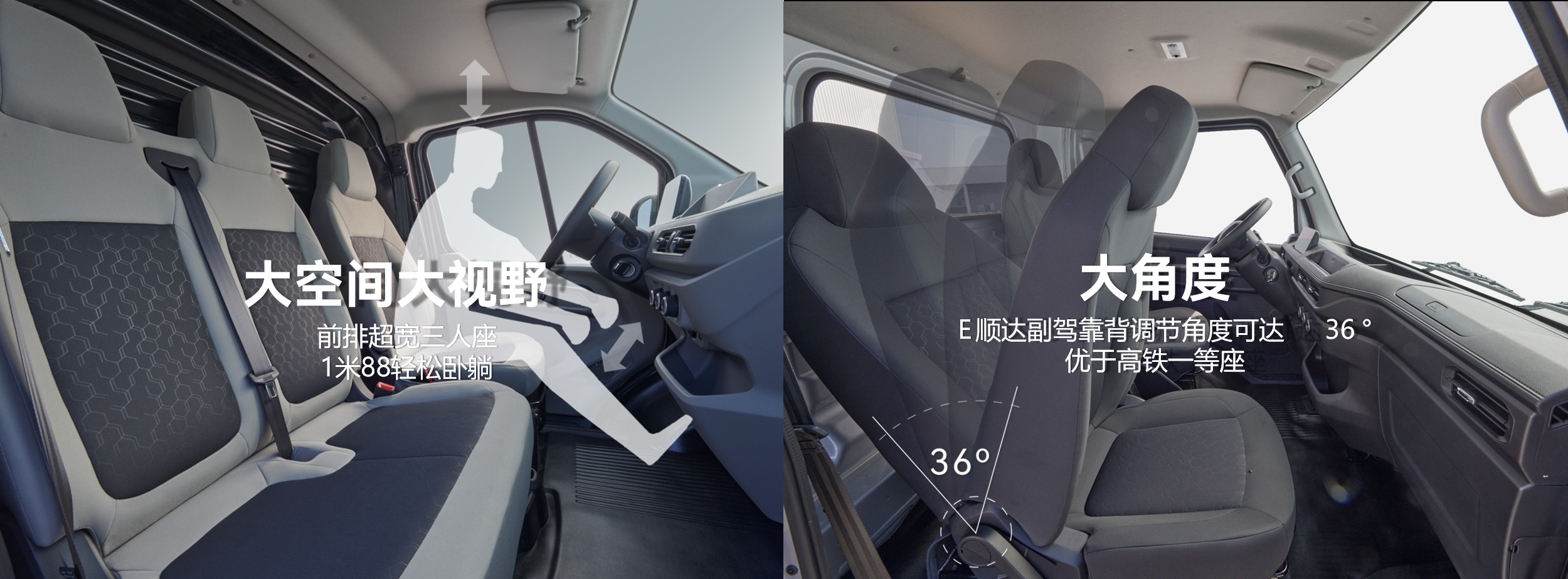 座舱空间大,1.88米的高个用户也不会压抑。E福顺还配备了行业少有的前排纯平三人座,更能满足用户的实际需求。E顺达副驾躺卧角度可达36°,优于高铁一等座的乘坐享受。同时,驾驶舱还拥有超大视野,标配怀挡和电子助力转向,还可配倒车影像,夫妻俩切换开车也完全没问题。