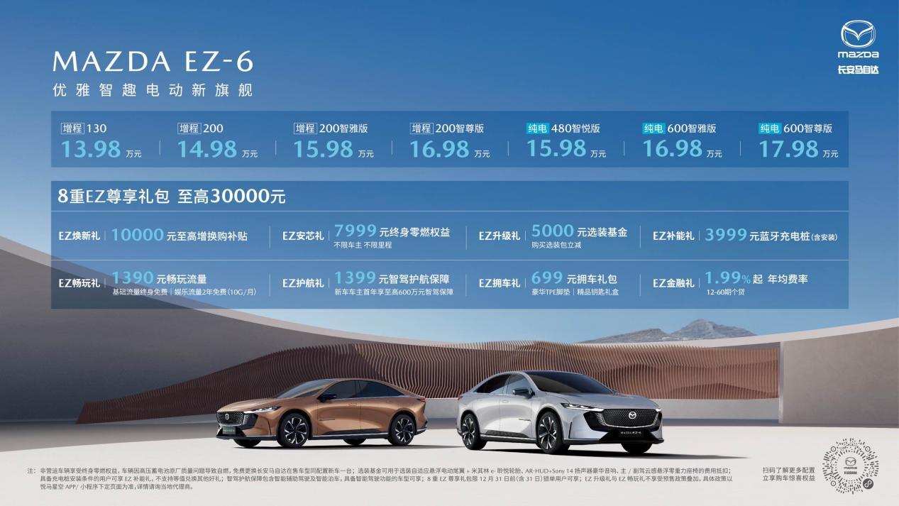 在好看、好开、好安全、好智能的「四好」基础上,MAZDA EZ-6更为国内市场用户带来了好价格。为了展现转型新能源市场的坚定决心,和拥抱中国用户的诚心,长安马自达在合资B级轿车市场首次打出了13.98万元的超低起售价,和高达30,000元的购车权益,只为和中国市场用户“交个朋友”。