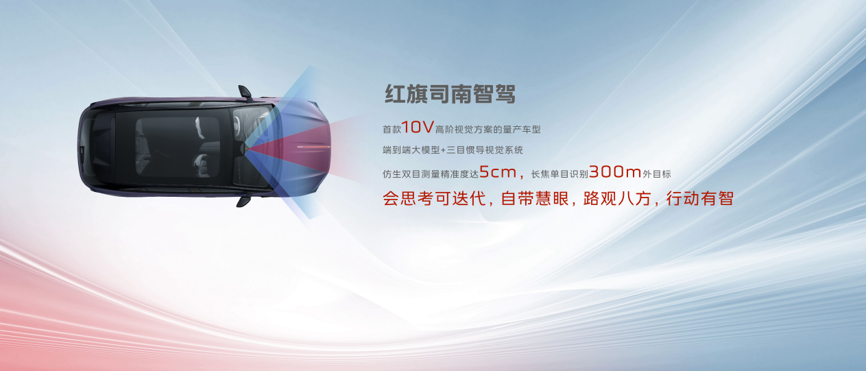 安全是红旗的底色,智能将是红旗的新章。在智能化时代,天工08融合科技智能化的造车理念,为用户打造了顶级智能驾驶解决方案。智行无疆,慧领八方,天工08搭载了红旗司南高阶智驾系统。作为行业首发10V高阶视觉智驾方案的量产车型,基于端到端的大模型,首创三目惯导立体视觉系统,仿生双目可精确锁定目标的立体形状和空间位置,测量精度达到5厘米;长焦单目则能识别300米以外的目标,保障高速场景的安全性。并通过OTA实现功能持续迭代升级,让天工08既会观察也会思考,既能明察全局,也能行动有智。不仅如此,天工08拥有高速NOA功能,支持自主超车变道、连续上下匝道、复杂分叉道路选择准确车道行驶等高速全场景领航辅助,百公里接管次数不到0.5次,实现高速全场景,长途惬意行。
