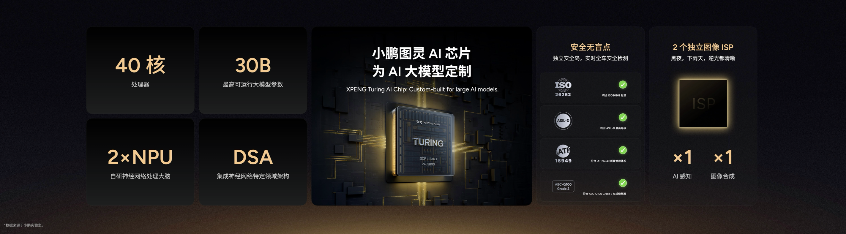 此外,「小鹏图灵AI芯片」将应用在小鹏汽车旗下的产品中,包括AI汽车、AI机器人和飞行汽车。官方还透露:『该芯片为AI大模型定制,拥有40核处理器,能够支持高达30B参数的大模型运行。』