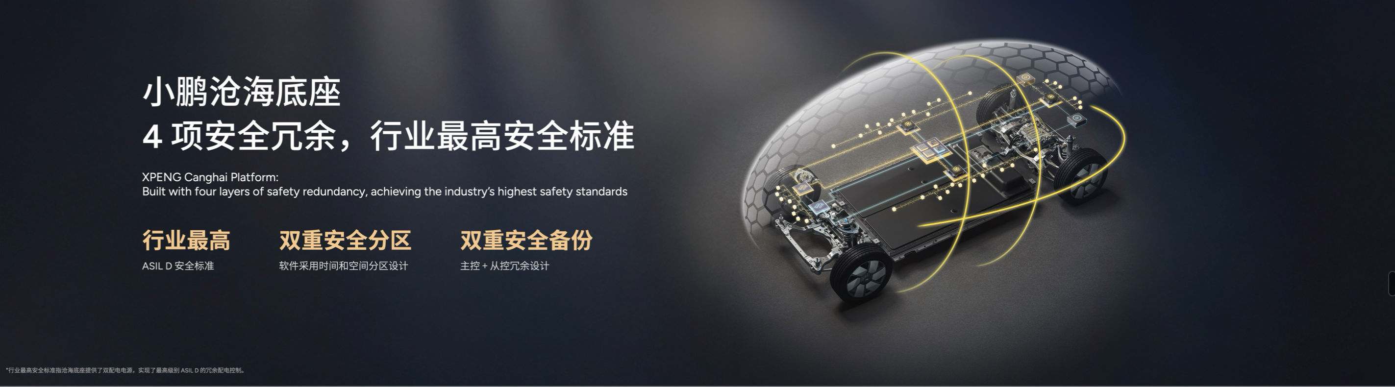 「小鹏沧海底座」是面向L4自动驾驶而设计,涵盖了核心计算平台、基础软件平台以及智能车控应用平台。据悉,「小鹏沧海底座」在安全层面,为控制器、执行器、通信、供电设计了4项冗余。在关键系统中实现了安全分区保护,具有90%以上覆盖率的诊断能力,确保在出现故障时能及时发现、及时隔离。