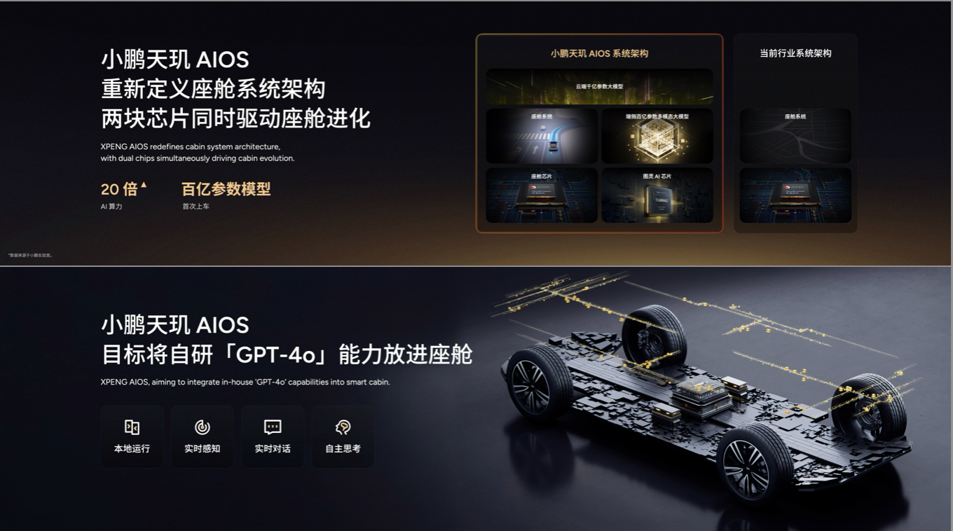 说完智驾的提升,接下来则是智舱。据悉,「小鹏天玑AIOS」将基于自研的「小鹏图灵AI芯片」,由2颗芯片同时驱动。同样与Open AI训练框架同源,小鹏汽车为了实现类GPT-4o大模型上车的目标,将大模型部署在本地。
