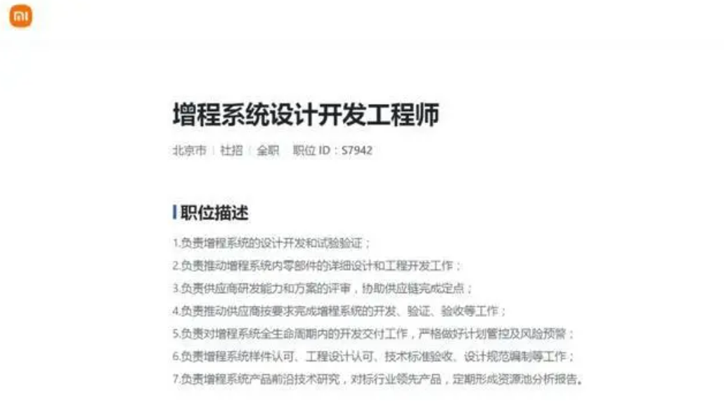 其实早在一年前,小米就在招聘增程系统设计开发工程师了,此外还包括燃油系统工程师、排气系统工程师等。
