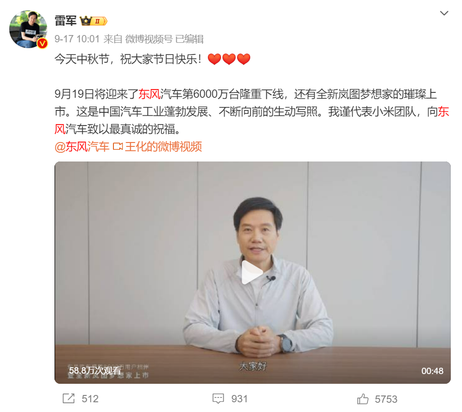 毕竟雷军本身是湖北人,又在武大上学,武汉的汽车产业链又相当完整,再加上小米的家电工厂刚在武汉动工建设,中秋节那天雷军还在社交平台给『东风汽车第6000万台隆重下线』送去了祝福,一系列巧合下来,东风汽车代工这件事儿确实有股草蛇灰线的苗头。