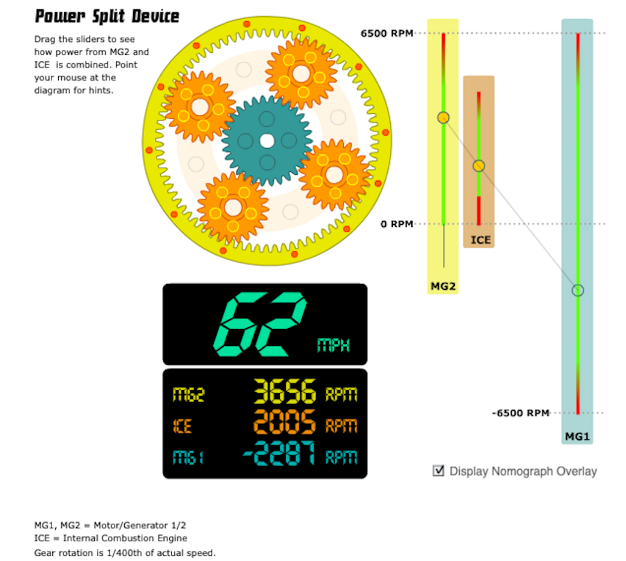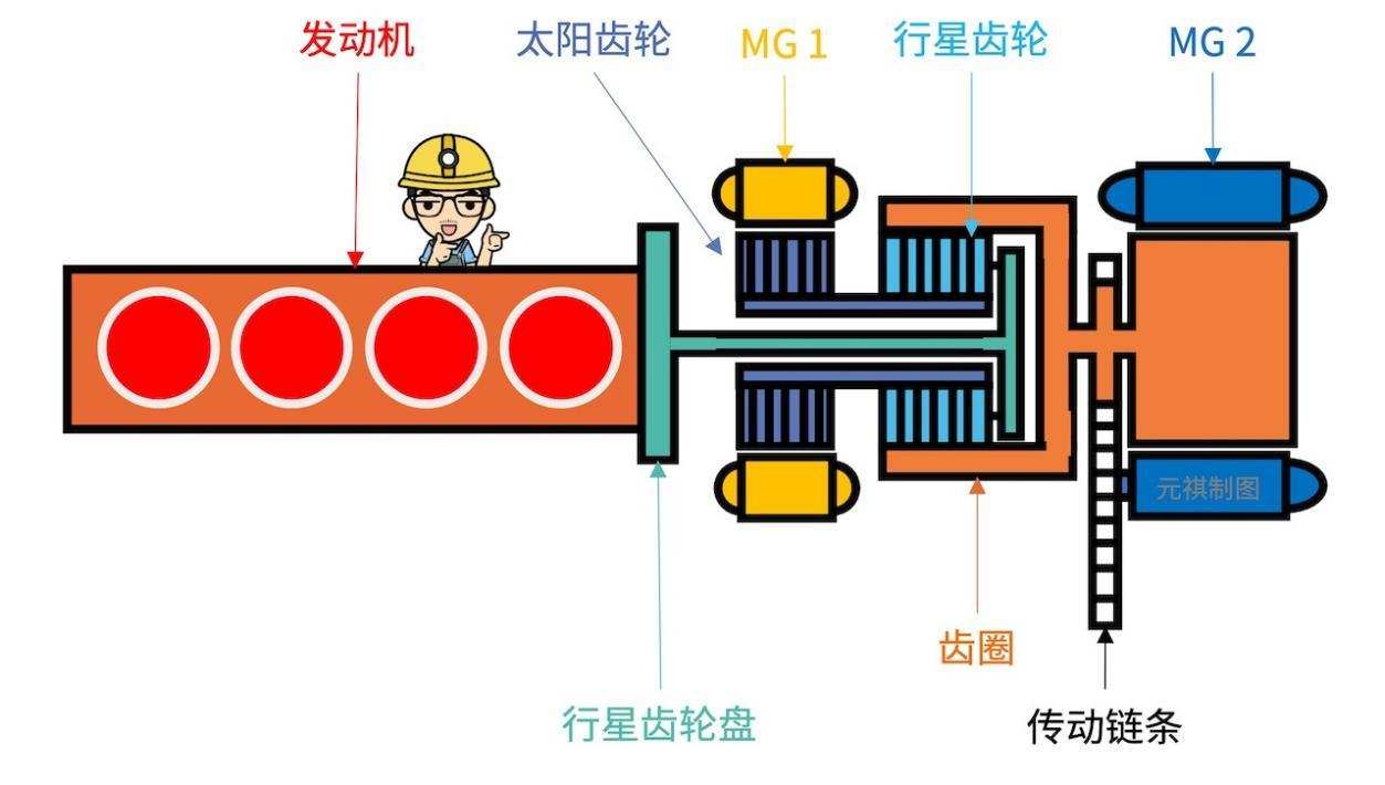 大家最为熟悉的功率分流系统应该就是丰田的THS。其由行星齿轮组与两个电机组成,行星齿轮组(行星排)中的组件(太阳齿轮、行星齿轮、行星支架、齿圈)分别与发动机、电机相连。