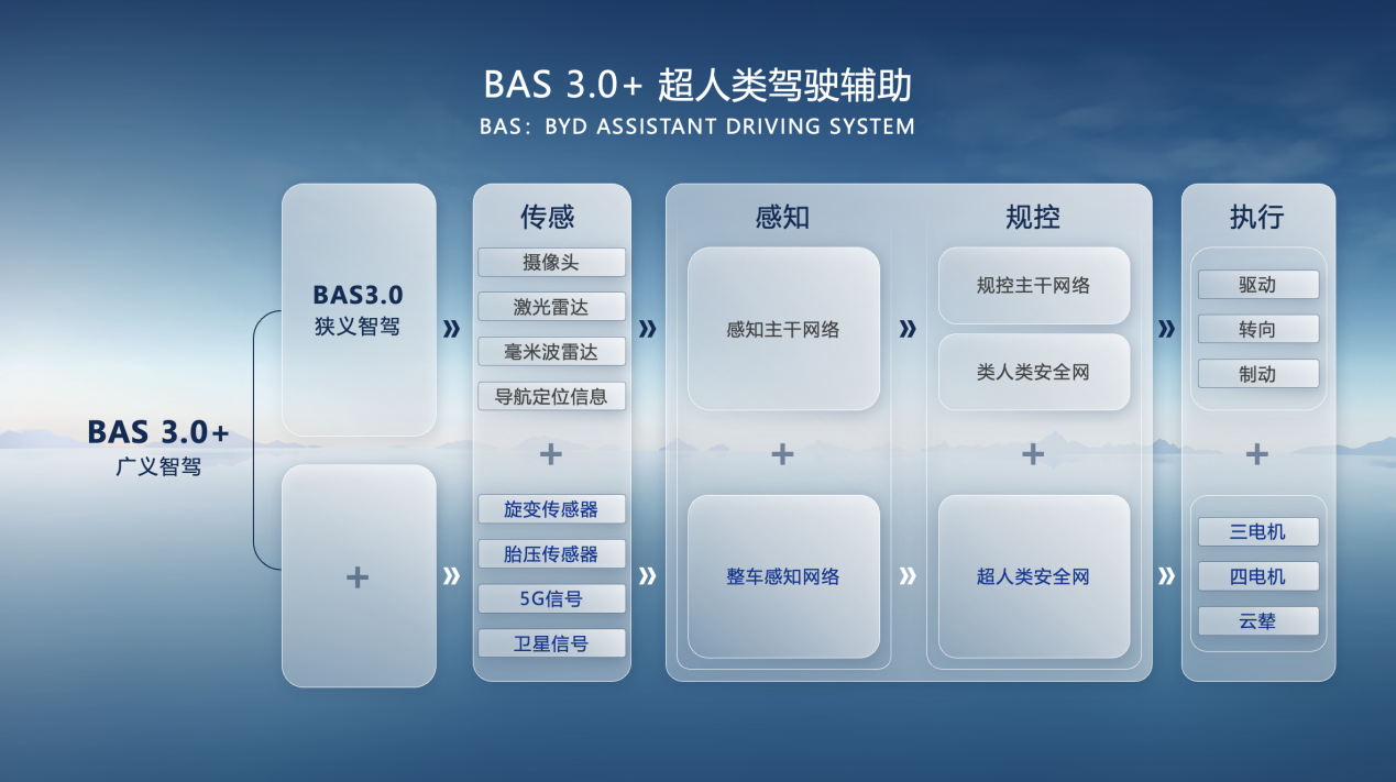 在感知层面,比亚迪天神之眼整车融合感知,物理直接传感与软件算法间接传感融合叠加,确保感知的全面与精准。