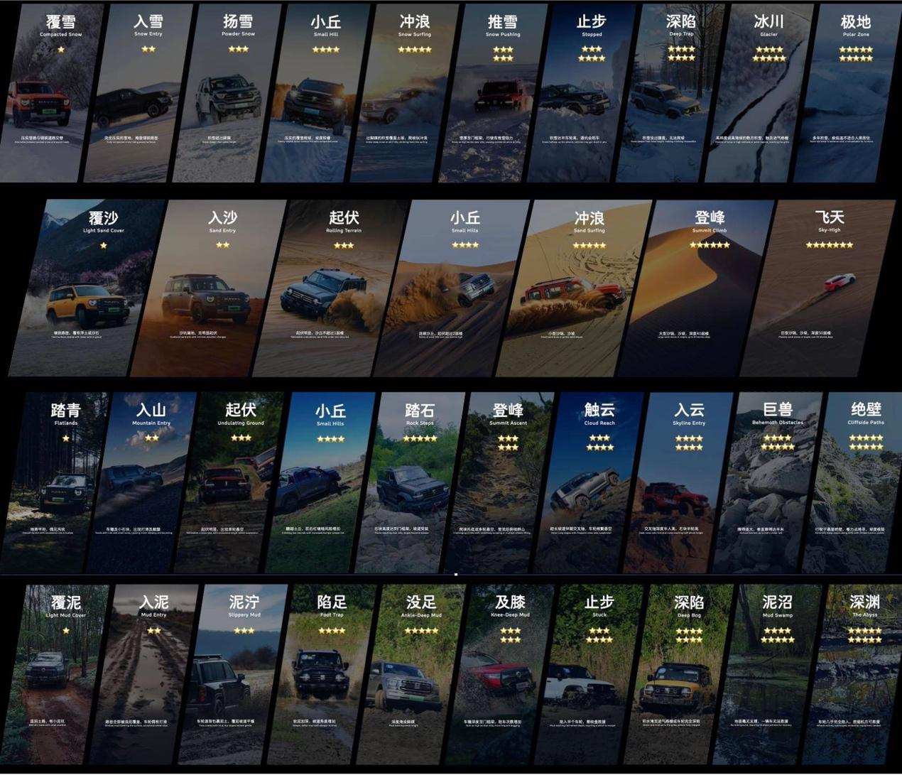 在以上数据的基础上,长城还与上百位资深越野玩家、专业越野车手以及行业技术专家沟通交流后,最终制定了本次的越野场景分级:将雪地、山地、沙地、泥地这四大场景,进行归纳细分便于用户理解。