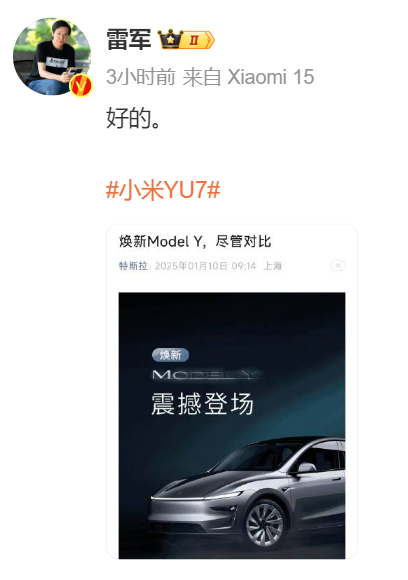 有趣的是,就在特斯拉Model Y在官方公众号发文『焕新Model Y,尽管对比』的当天,雷军在其微博账号,截图该篇文章,回应称『好的』并在下方带上了自家第二款车型,也就是上面提到的小米YU7的标签。