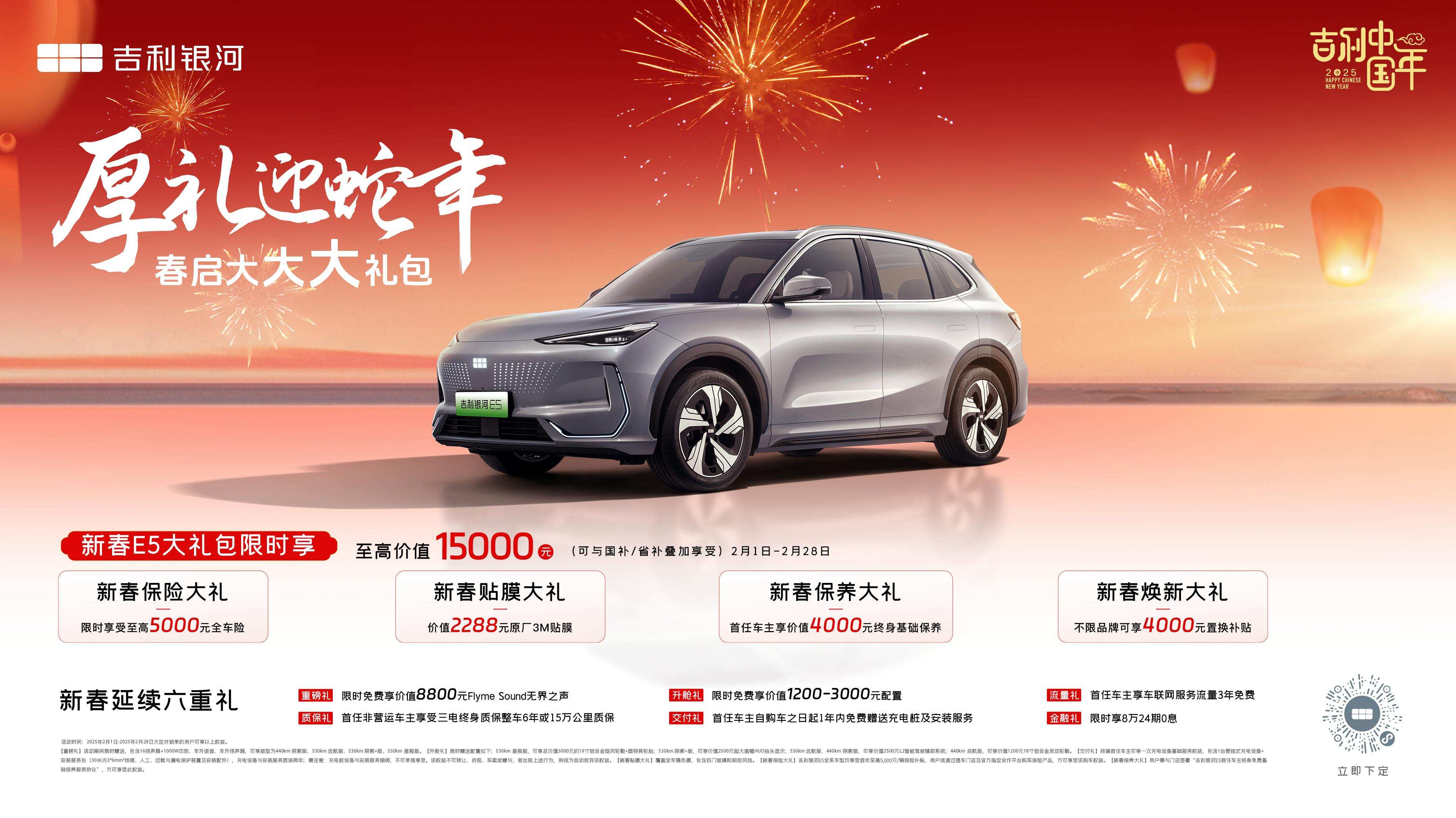 开年见喜,吉利银河E5送钜惠好礼!为回馈用户支持,吉利银河E5推出新春大礼包,立享至高价值1.5万元的,包含新春保险大礼、新春保养大礼、新春贴膜大礼、新春焕新大礼,四重好礼惠及消费者,一站式福利待领取,省钱又省心。