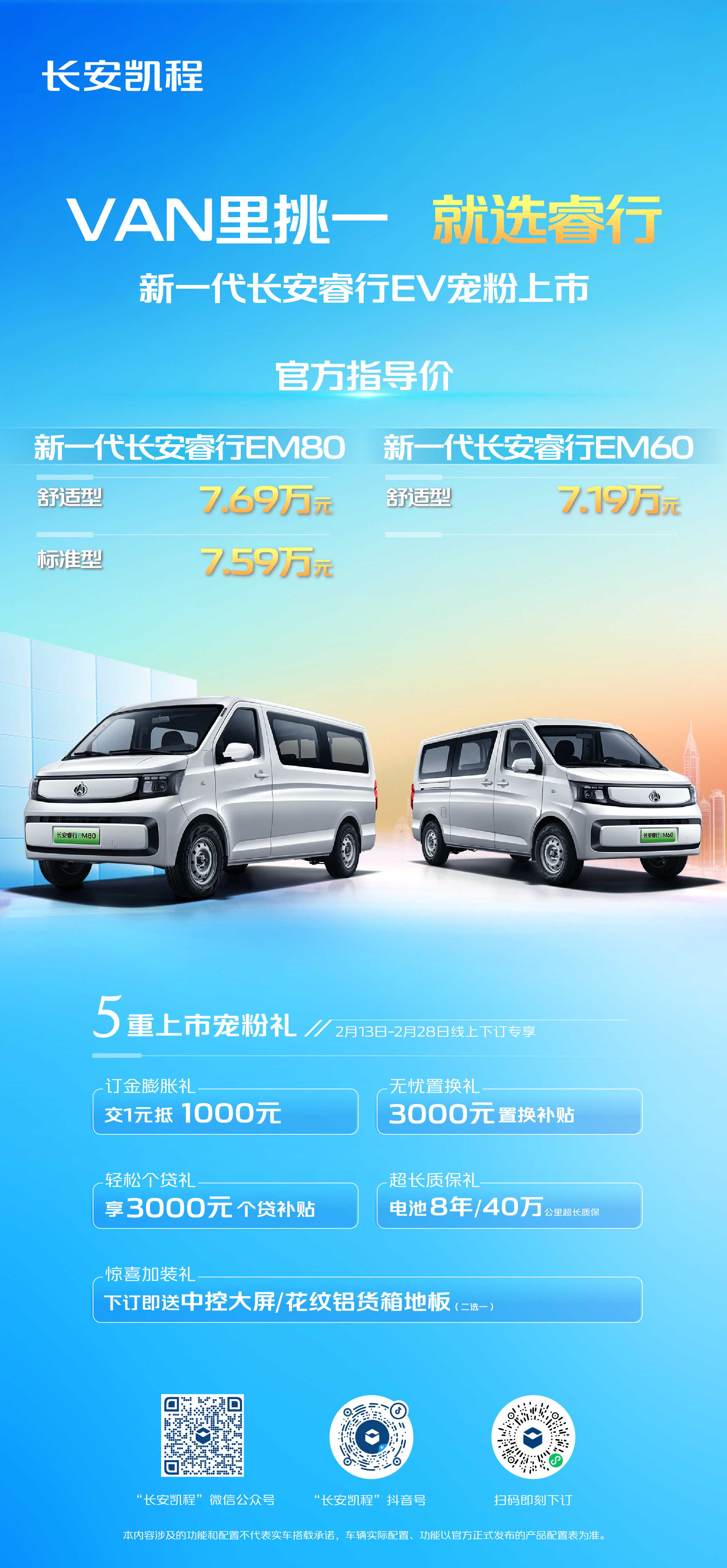 作为长安凯程数智新能源商用车科技品牌转型下的经典纯电焕新产品,新一代长安睿行EV在承袭品牌安全、可靠、高品质的基础上,以用户为中心,在续航、承载及空间设计等方面实现全面进阶,助力千行百业奋斗者开启创富新征程。为了回馈广大新老用户,2月13日至2月28日通过长安凯程官方小程序/APP线上下订专享五重上市宠粉礼,具体包括: