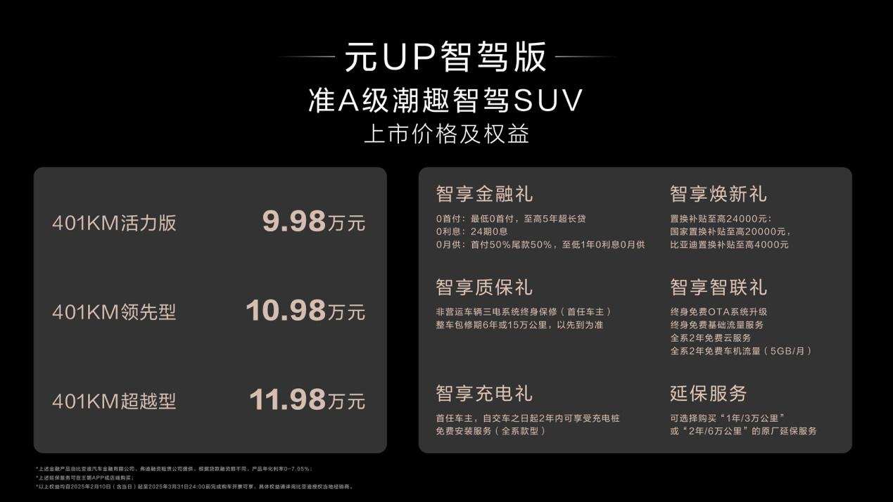 据悉,在2025年3月31日前购元UP智驾版,可享包括智享智联礼在内的多项新车上市权益,享受终身免费OTA系统升级、终身免费基础流量服务、全系2年免费云服务、全系2年免费车机流量,进一步拉低了用户享受高阶智驾的门槛。