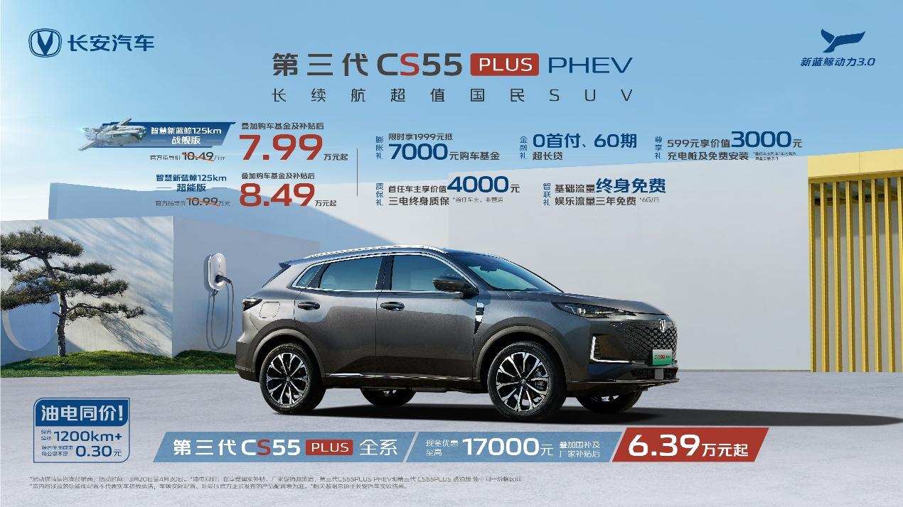 第三代长安CS55 PLUS作为一款“全球百万用户优选爆款SUV”,动力卓越,颜值出众,性价比超高,堪称市场上的超值之选。此次第三代CS55PLUS PHEV的推出,不仅展现了长安汽车在新能源领域的技术实力,更以补贴后7.99万元起售的“油电同价”诚意,五重购车权益,以及实测每公里仅0.29元的超低用车成本,为用户带来“购车无压力,用车无焦虑,养车更轻松”的全新体验。有购车打算的朋友不妨就近到长安4S店抢鲜体验,尽早享受更经济、更智能、更安全的带电出行新生活。