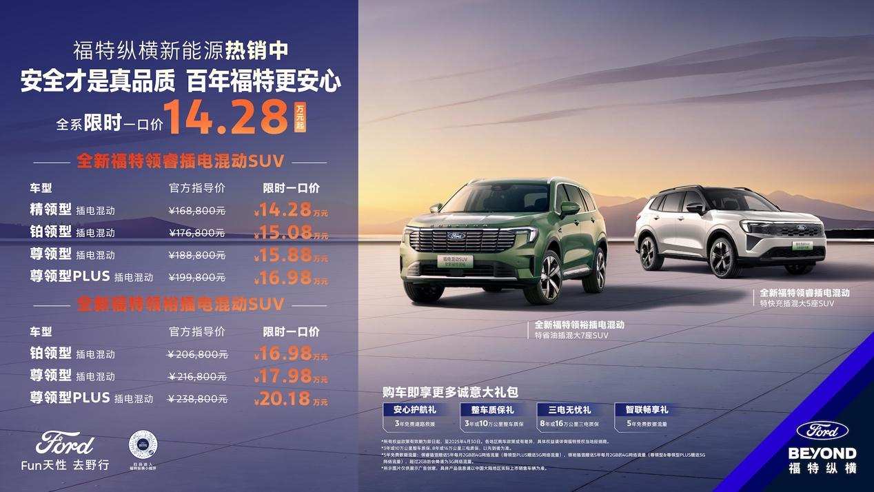 福特纵横新能源最近发布了“全系限时一口价”活动,适用车型为全新福特领睿/领裕插电混动SUV。其中全新领睿插电混动SUV原本售价区间为16.88万-19.98万元,一口价区间为14.28万-16.98万元;全新领裕插电混动SUV原本售价区间为20.68万-23.88万元,一口价区间为16.98万-20.18万元。