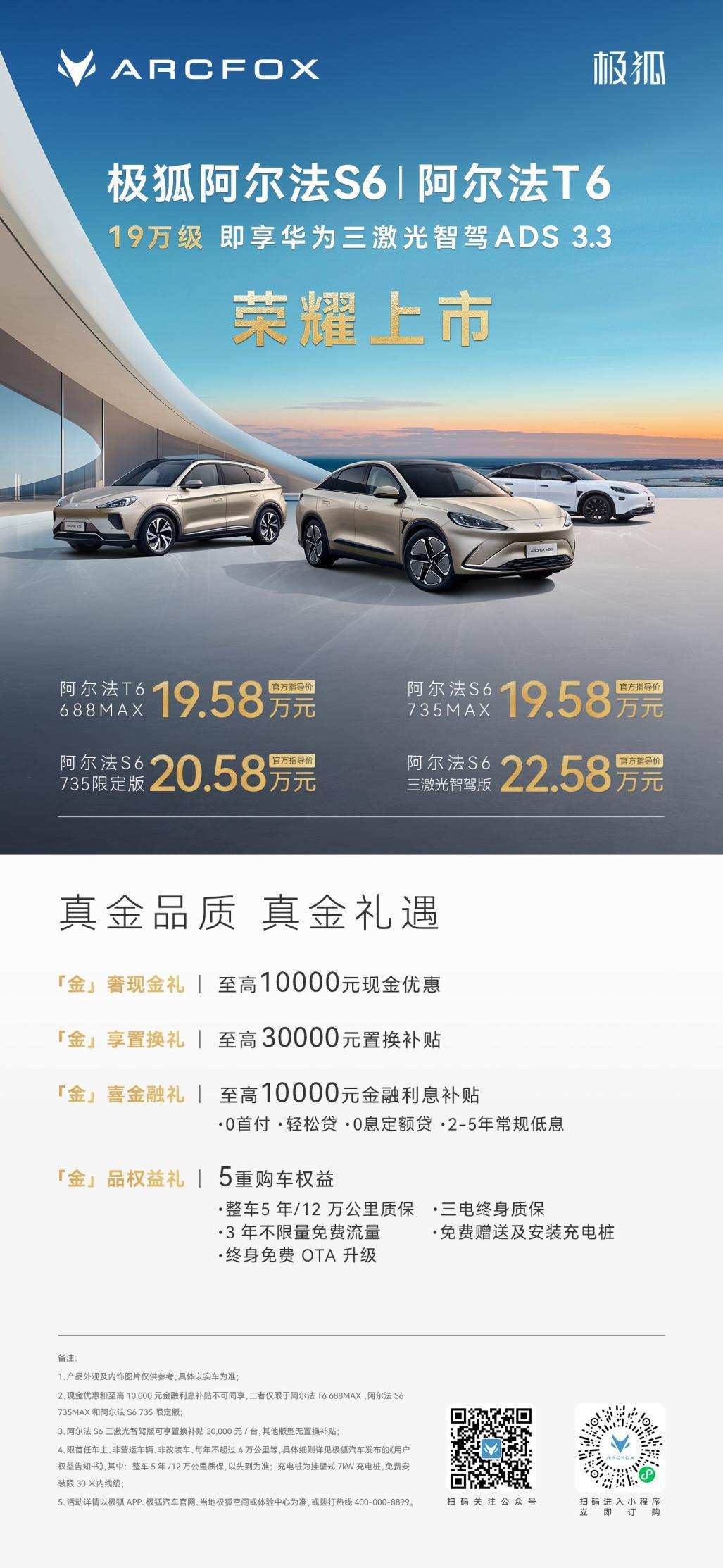 极狐的智能化步伐还在继续,4月2日,极狐汽车再次发布新品,阿尔法新6系上市,将智驾平权的门槛再度降低,同时也将智驾水准大幅抬升。配备了3激光雷达、搭载华为乾崑智驾ADS 3.3的极狐阿尔法S6,20万内就能搞定你敢信?极狐阿尔法T6,用19万级重新定义中大型SUV,给到用户百万级豪车的超品质,也将极狐汽车“死磕品质”的执念再次提到一个新高度。