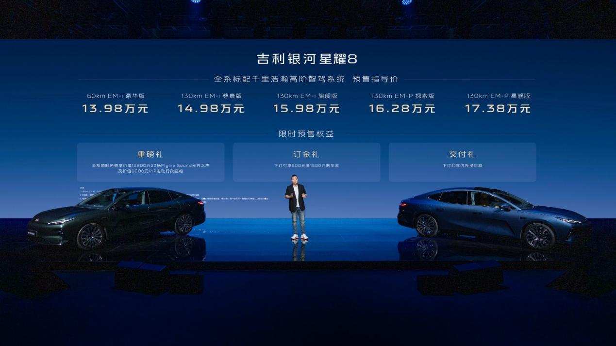 4月10日晚,吉利银河旗下全新中大型豪华电混轿车——星耀8在上海正式开启预售。本次预售共推出5款车型,价格区间为13.98-17.38万元。据悉,新车将于5月正式上市,整场发布会上,新车旨在以『5米级车身+3L级馈电油耗』为核心卖点,从而抢占中高端新能源市场份额。