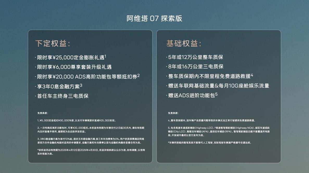 即日起至2025年4月30日,下定用户可限时享25,000元定金膨胀礼遇,阿维塔07探索版权益后价格低至23.49万元~24.49万元;在此基础上,用户还可限时享6,000元尊享套装升级礼遇、20,000元ADS高阶功能包等额抵扣券、3年0息金融方案、首任车主终身三电质保,共5大下定权益。叠加5年或12万公里整车质保、8年或16万公里三电质保等基础权益,多重礼遇开启高品质出行体验。