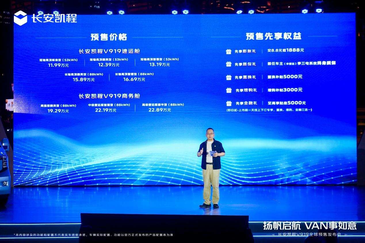 扬帆启航,VAN事如意!4月28日,长安凯程V919全球预售发布会盛大举行。明日数智轻客——长安凯程V919正式开启预售,长安凯程V919速运舱预售价11.99万元起,长安凯程V919商务舱预售价19.29万元起。