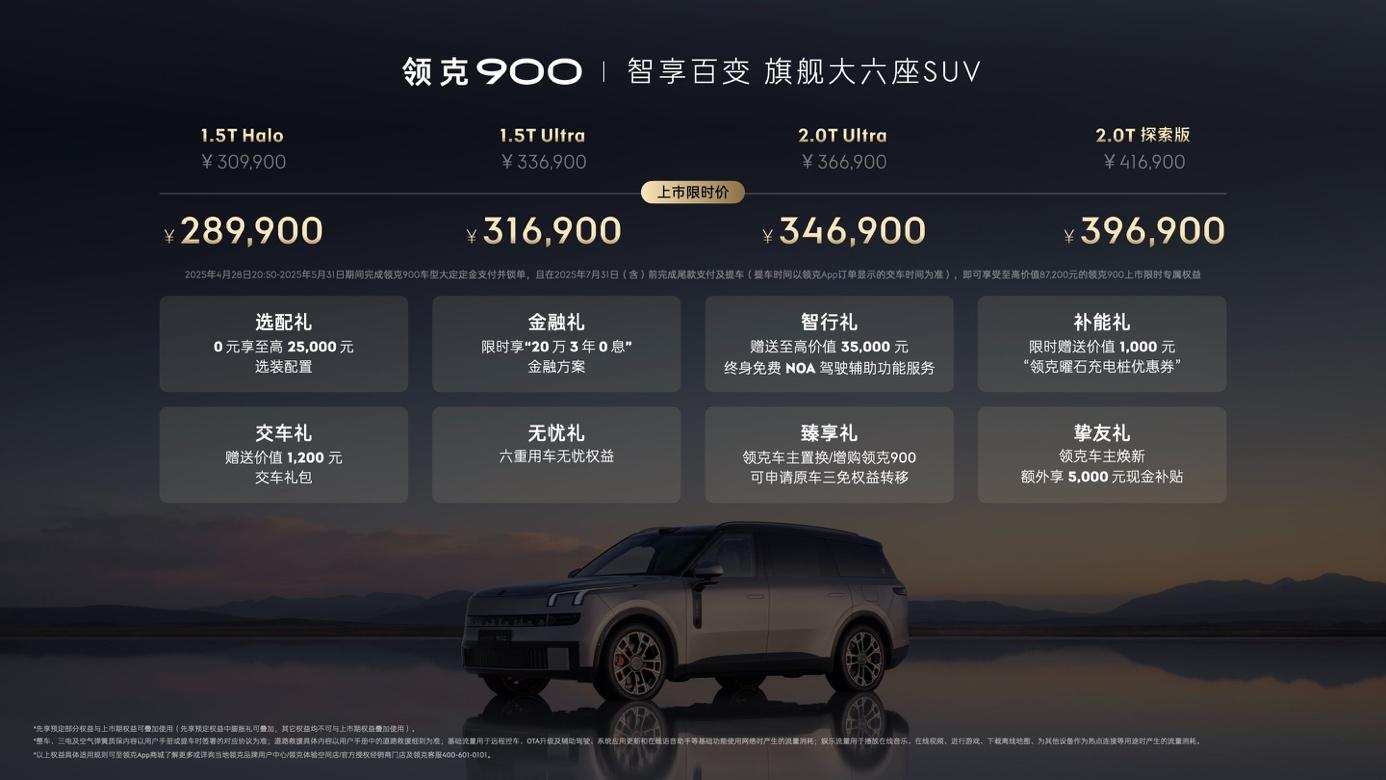 我们从大家最关心的价格和选购环节开始。本次领克900推出1.5T Halo、1.5T Ultra、2.0T Ultra 、2.0T探索版四大配置,名称与预售时相同,限时售价28.99万元至39.69万元。此外,权益方面,领克准备了八重订车礼遇,5月31日(含)前锁单可享至高价值87200元的权益,详情可通过领克APP、小程序等官方平台进行咨询。