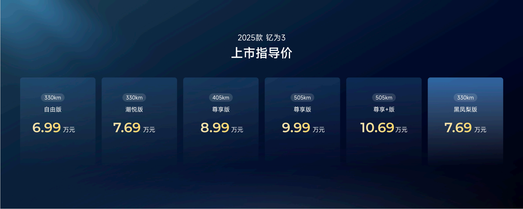 4月24日苏州湾大剧院,2025款钇为3正式焕新上市,总共推出5个版本,价格区间在6.99万元-10.69万元。值得一提的是本次焕新还推出“黑凤梨”趣改版,售价7.69万元。