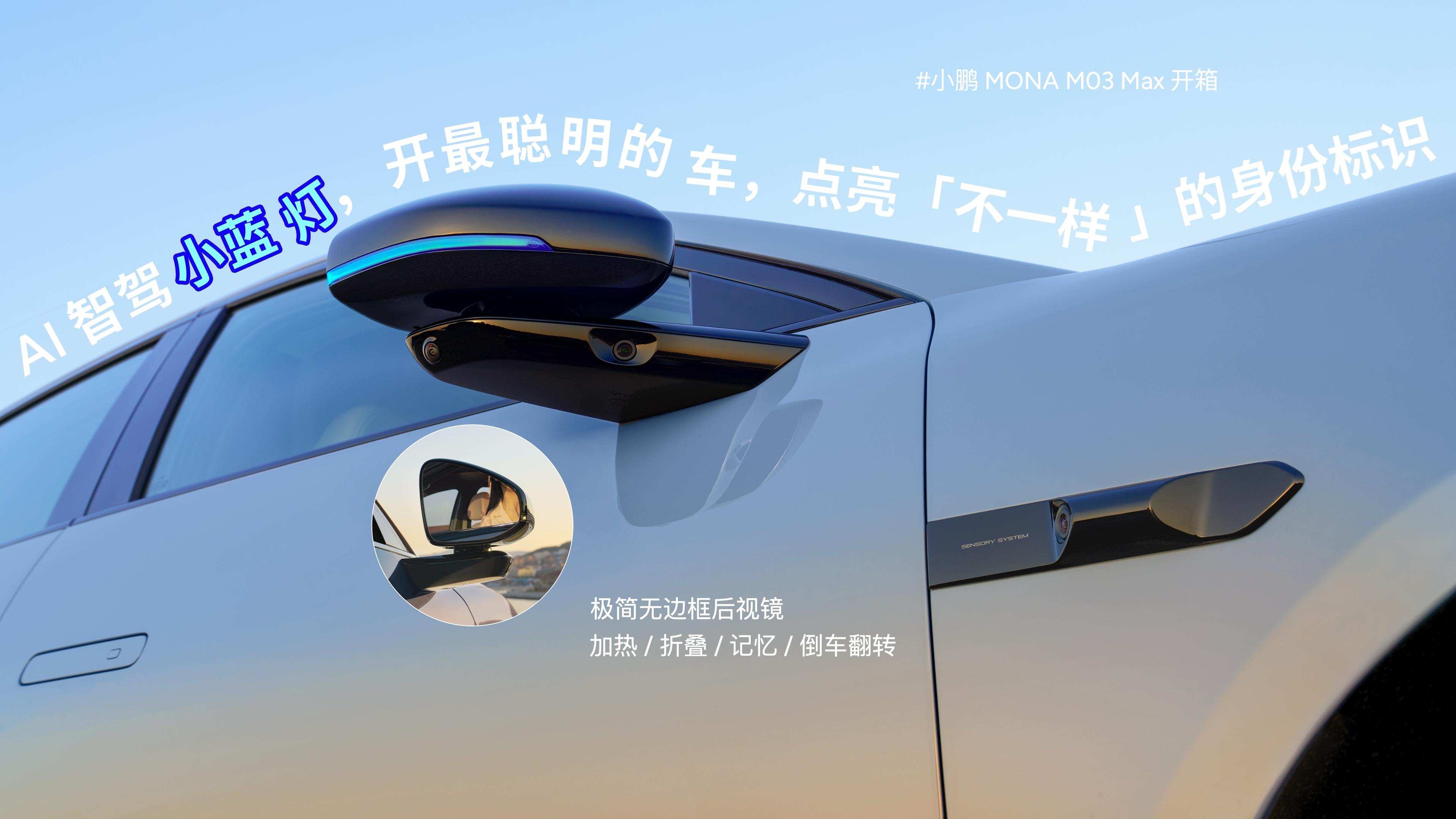 小鹏MONA M03 Max后视镜将升级为颜值更高、更受年轻用户喜欢的极简无边款设计,集加热/折叠/记忆/倒车翻转等功能于一身,并将MONA M03车主喜爱的辅助驾驶小蓝灯也集成进去,实现美学与功能的完美融合。针对当下年轻用户喜欢的露营活动,小鹏MONA M03 Max新增V2L对外放电功能,支持最大3.3kW对外放电功能,户外露营时车辆秒变移动电源,全面提升户外用车体验。