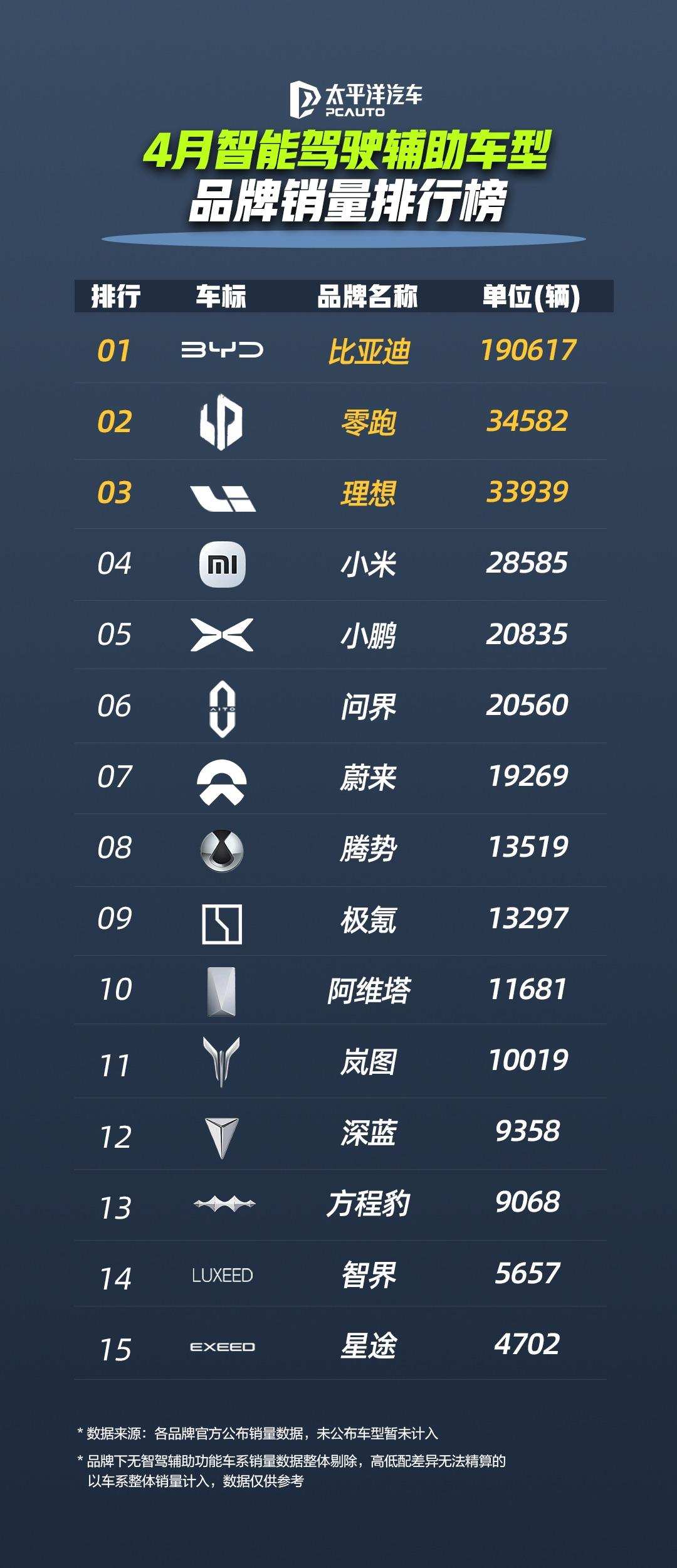 基于乘联会及第三方数据交叉验证的 “智能驾驶辅助车型 4 月品牌销量排行榜” 显示,比亚迪优势巨大,领先优势超鸿蒙智行、理想、小鹏等品牌销量总和两倍,中国智驾汽车市场 “一超多强” 格局显现。