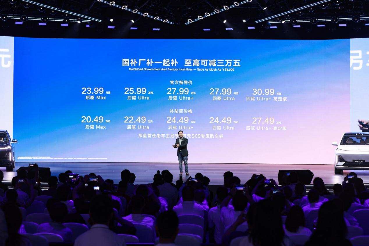 5月22日,深蓝品牌之夜在重庆举行,同时深蓝S09正式上市,本次共推出5款配置,分别为后驱Max、后驱Ultra、后驱Ultra+、四驱Ultra、四驱Ultra+高定版,价格区间为23.99万至30.99万元。此外,从官方数据来看,截止5月22日24:00时,深蓝S09的大定订单累计销量突破了21168辆。