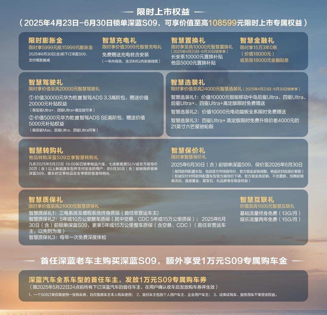 更值得一提的是,深蓝S09还承诺『一年保价』,深蓝宣布2025年6月30日(含)前下订,保价1年(*统一保价至2026年6月30日,限同款车型市场指导价下调或现金促销)。详情可通过官方渠道进行了解。