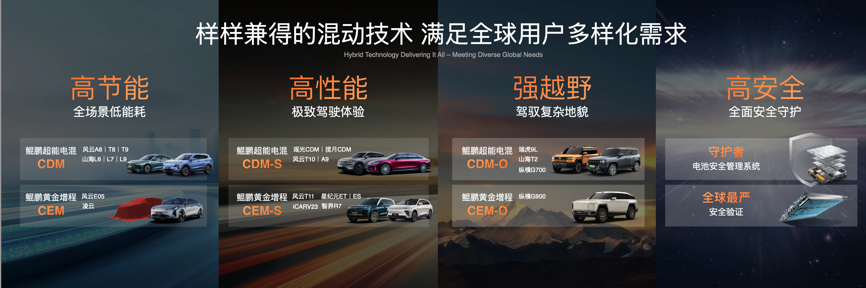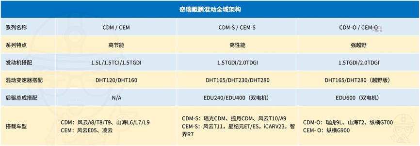 按我的理解,目前官方将所有与混动相关的架构称之为『奇瑞鲲鹏混动全域架构』。在这个大概念下,所有搭配燃油总成的混动系统分为了『奇瑞鲲鹏超级混动平台』(即「CDM」)以及『奇瑞超级黄金增程平台』(即「CEM」)。