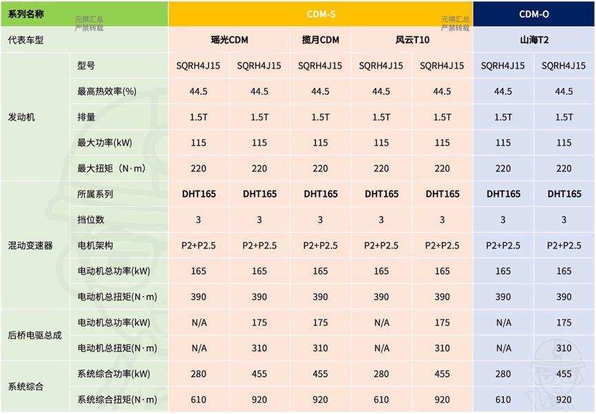 同时,从之前的表格中我们也可以看到,目前的CDM-S与CDM-O系列皆是搭载『DHT165+ 1.5TGDI(SQRH4J15)』的动力组合。而两者从奇瑞对其混动的代际划分来看,同属『CDM 5.0』。这里留个扣儿,关于『代际问题』后面还会细说,先把『现在进行时』的几套混动系统说完。