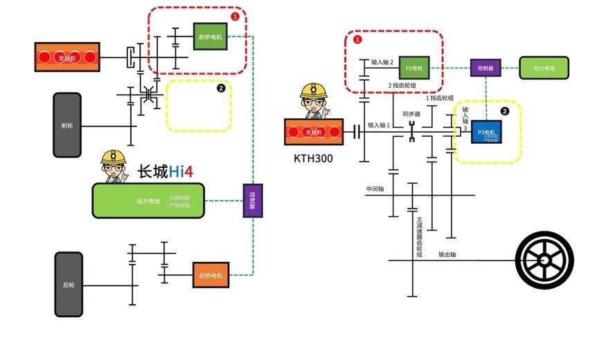 前桥动力逻辑:长城Hi4想要提升动力,主要依靠提升「发动机」的动力,也就是重『油驱』;相较之下,KTH230更注重电驱,若要提升前桥动力,可以提升「P3电机」的动力,简单说就是换『大电机』