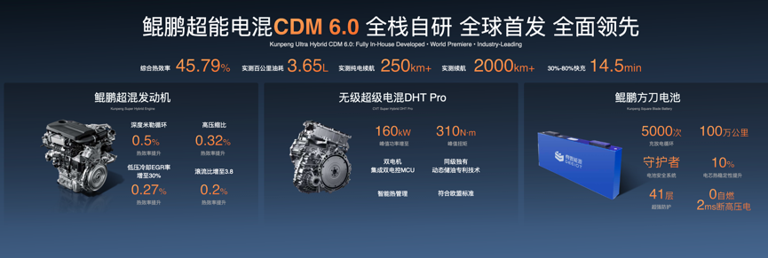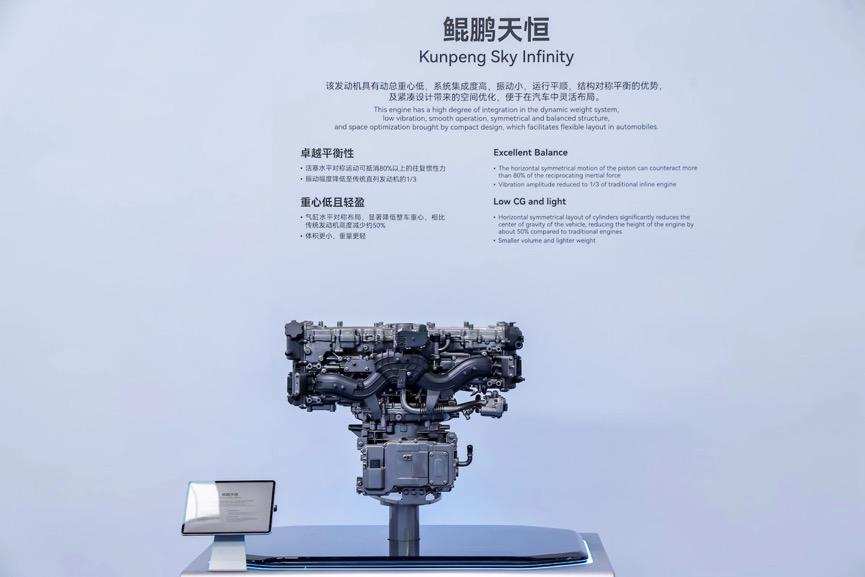 最后,还有一款专门用于CEM(即增程)的「水平对置混动专用发动机」——『鲲鹏天恒』。目前对此发动机的具体技术并未公开太多,官方主要解释了搭载该「混动专用发动机」的CEM系统的整体效果: