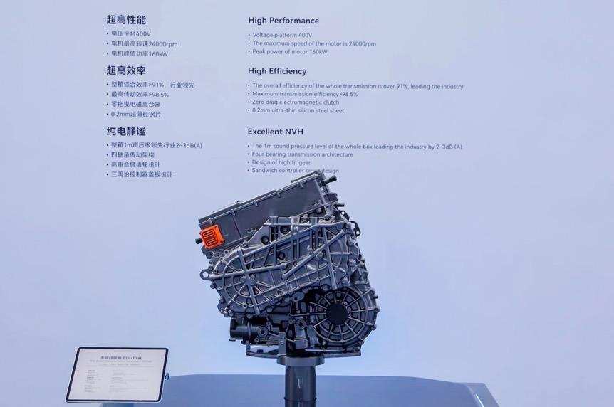 DHT150采用深度集成设计, 轴向尺寸374mm,体积功率密度为31.9Nm/kg;采用双V斜级高效双电机,功率密度大,NVH降低7dB(A);此外,采用车规级四核双电控MCU,谐波注入、变载频控制技术,实现NVH降低6dB(A)。同时,双面水冷MCU配合油冷扁线电机,实现电机系统平均效率超92%。高效齿轮配合高速轴承、动态储油技术,实现超低拖曳扭矩,EV最高传动效率98.5%。