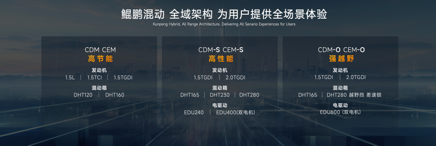 最后,回到最初的起点,我们重新来捋一下『奇瑞鲲鹏混动架构』,从大框架来看分『奇瑞鲲鹏超级混动平台』(即「CDM」)以及『奇瑞超级黄金增程平台』(即「CEM」)。从产品属性来看分节能(不带后缀)、性能(后缀『S』)以及越野(后缀『O』)。