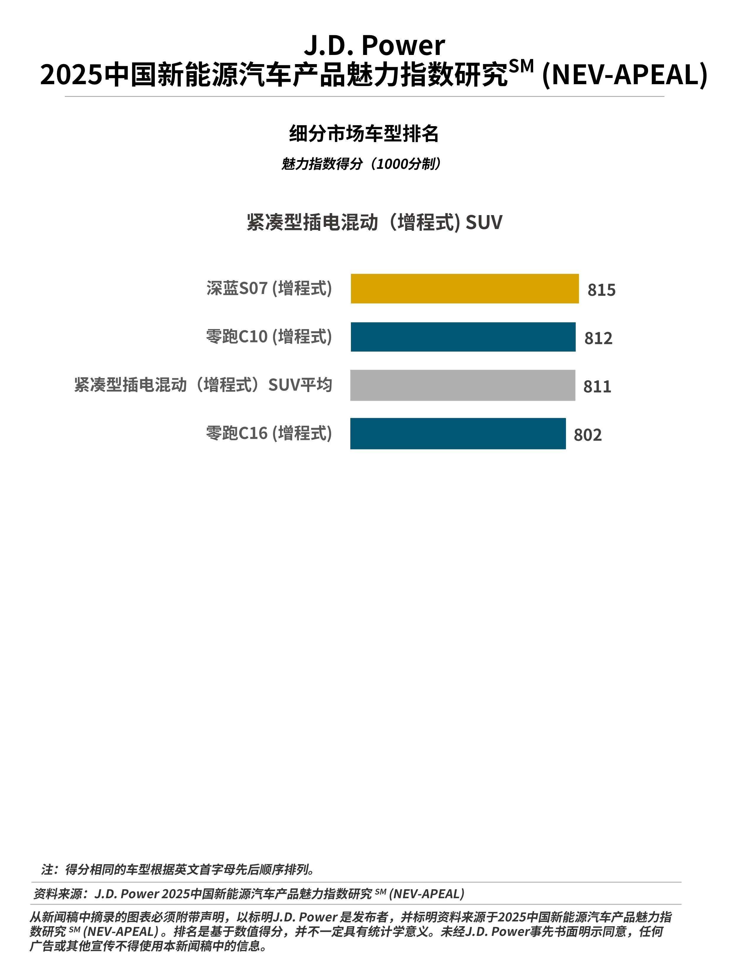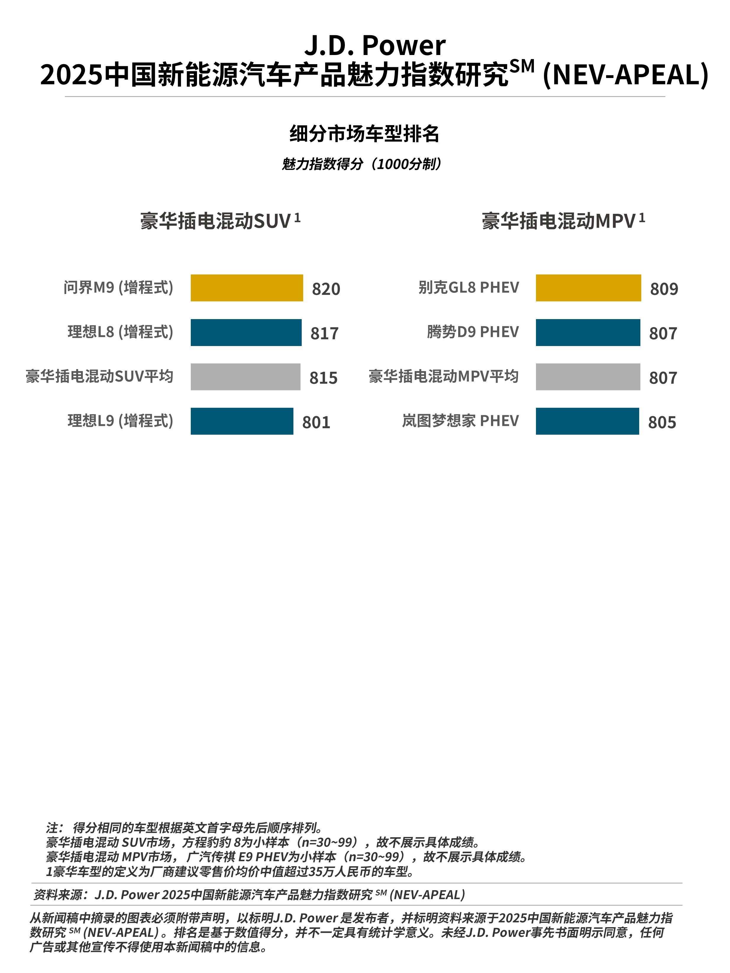 共有来自14个细分市场的14款车型在2025中国新能源汽车产品魅力指数研究SM(NEV-APEAL)中摘得奖项。小型纯电动SUV、豪华插电混动轿车、主流插电混动MPV及主流纯电动MPV细分市场因为不满足细分市场获奖条件,因而没有奖项颁出。获得所在细分市场奖项的车型有: