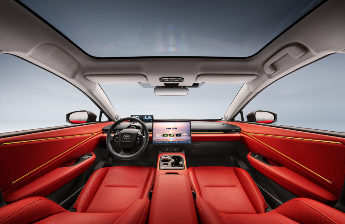 外观方面,bZ5和bZ3C基本没有区别,可以将bZ5视为bZ3C的量产版本。其延续了丰田电动车设计语言。前脸配备贯穿式LED灯带,搭配两侧C字形大灯组及熏黑进气口设计,整体造型锐利有神。车侧采用轿跑SUV造型,拥有溜背式设计,配合造型别致的7辐轮圈以及贯穿式尾灯,营造出较强的运动感。