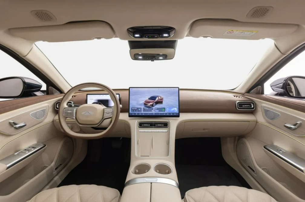 内饰方面,双色拼接的软质包覆、木纹饰板以及部分麂皮材质的混搭。双辐式方向盘采用电子怀挡设计,前方配备全液晶仪表盘,中控则搭载15.6英寸悬浮式触控屏,底层搭载8255芯片,此外新车还配备23扬声器、AI大模型智能伴侣、540全景影像、无级可调氛围灯和智能香氛系统等配置。