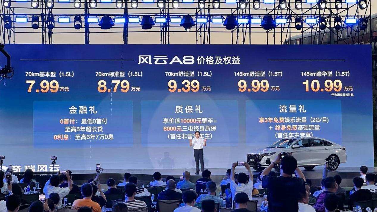 6月5日晚,市场上又迎来一款『799』级的紧凑级插混轿车——奇瑞风云A8(下称「风云A8」)。新车推出5款配置车型,售价7.99-10.99万元,有1.5L/1.5T两套混动系统可选,CLTC纯电续航也有70km和145km两套方案。无论是价格还是定位,奇瑞无疑又和比亚迪杠上了,除了比亚迪秦L DM和海豹06 DM,吉利银河L6、长安启源A05也在其扫射范围之内,这几款车的终端起售价都在7-9万元之间。
