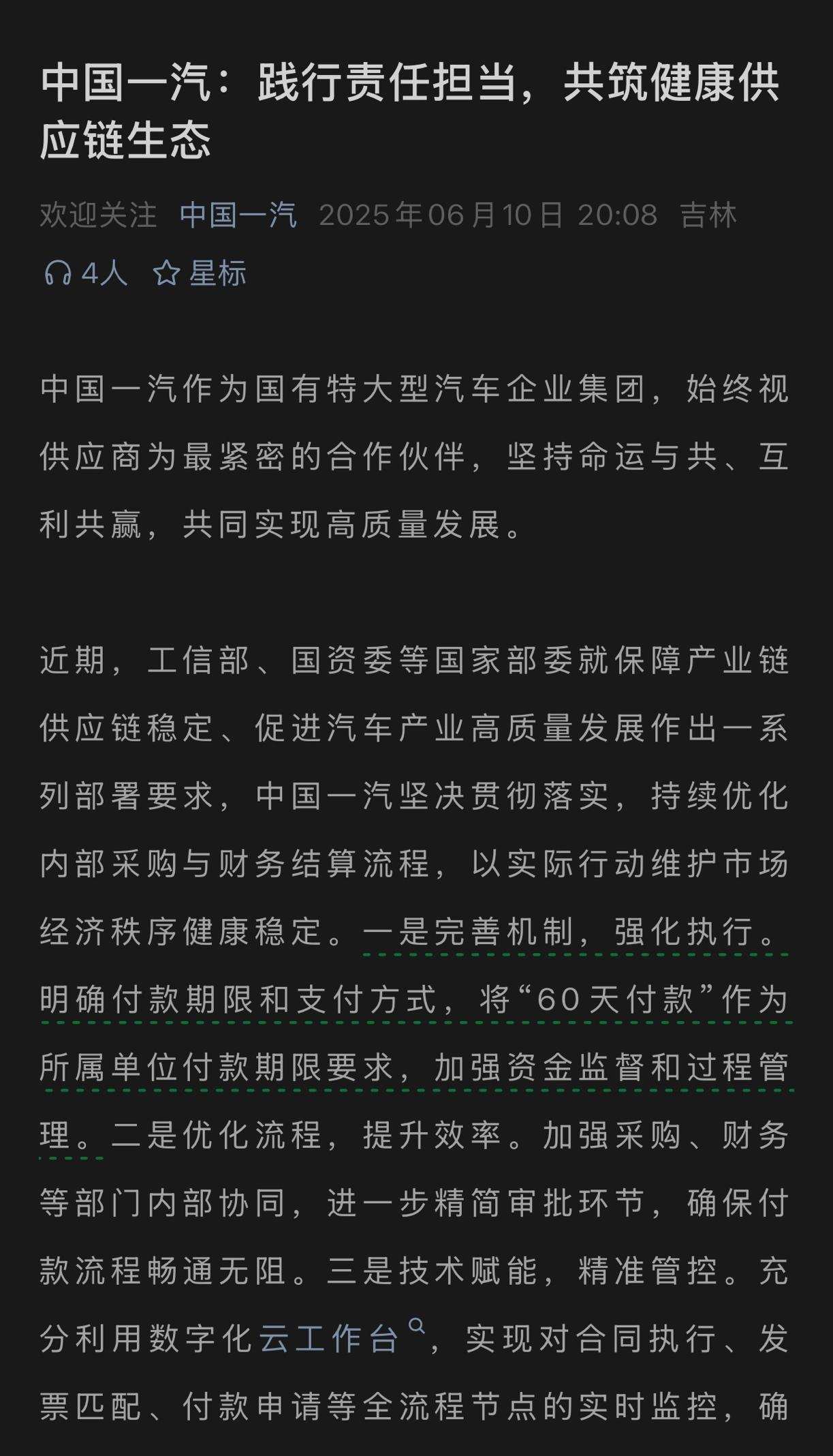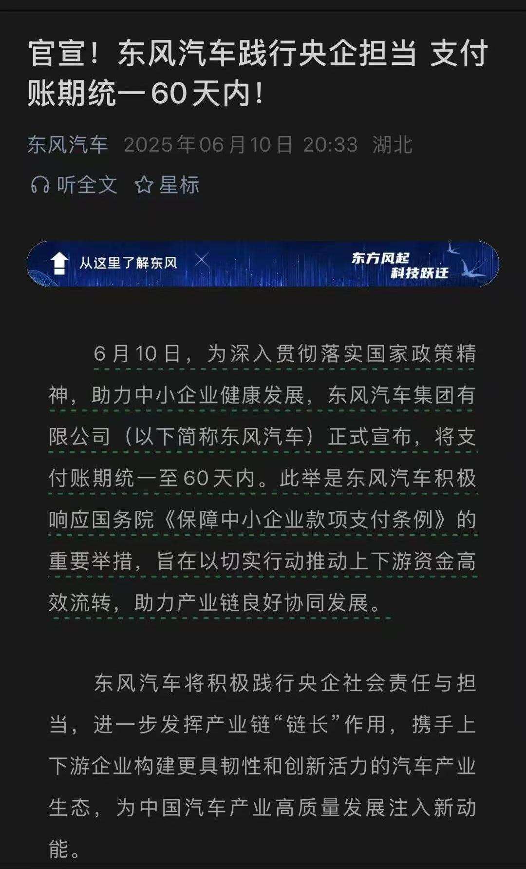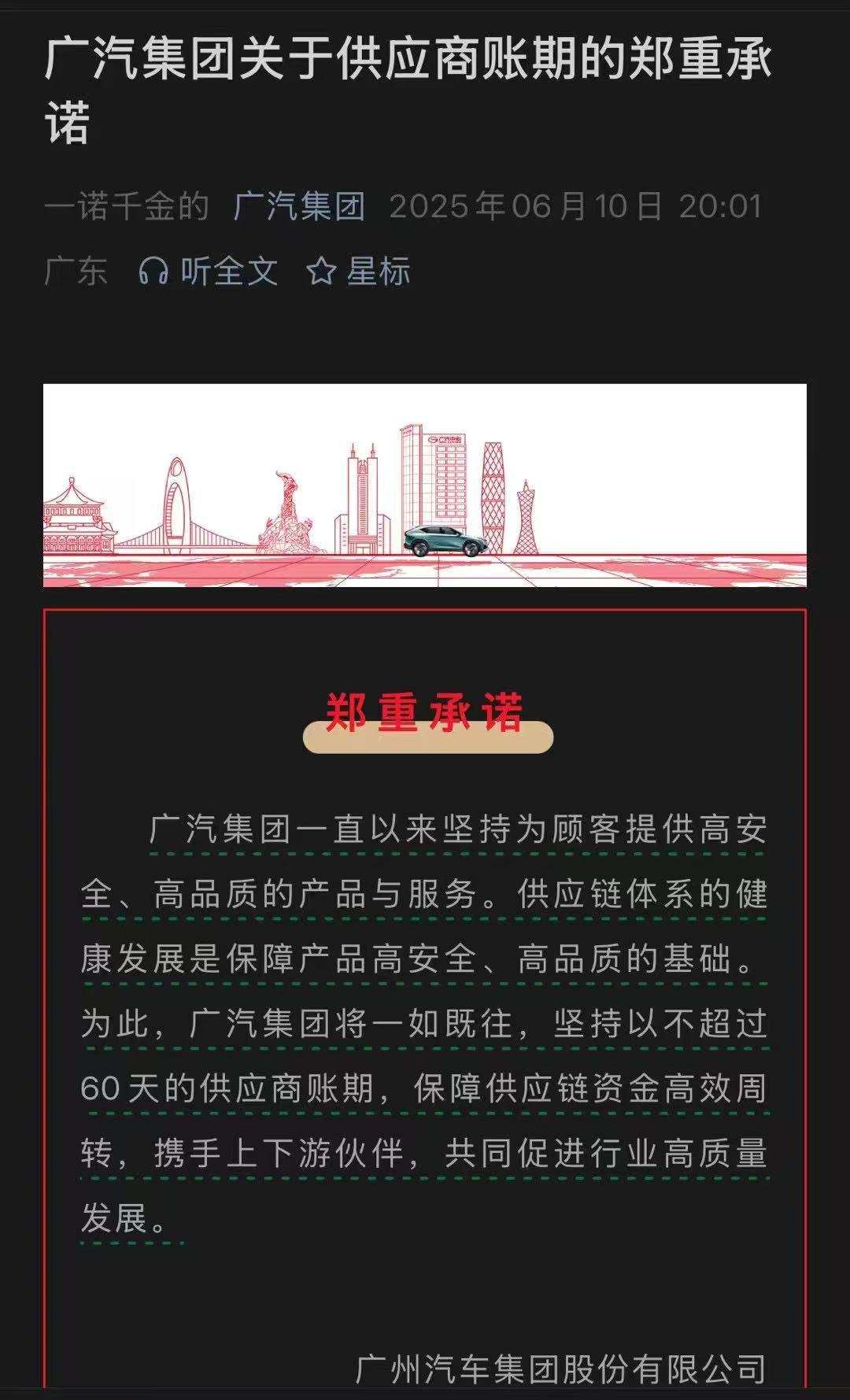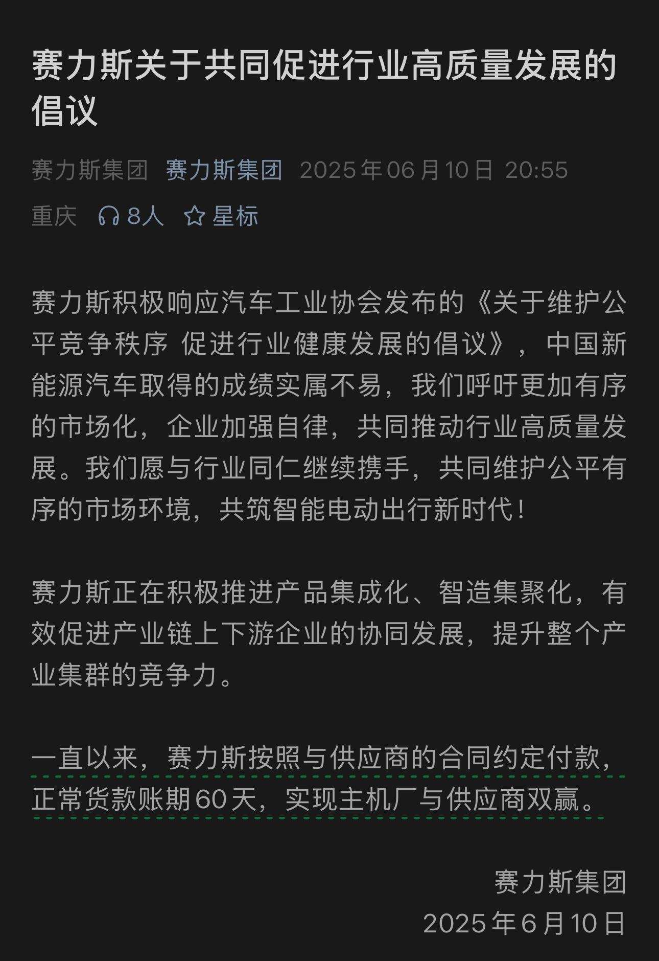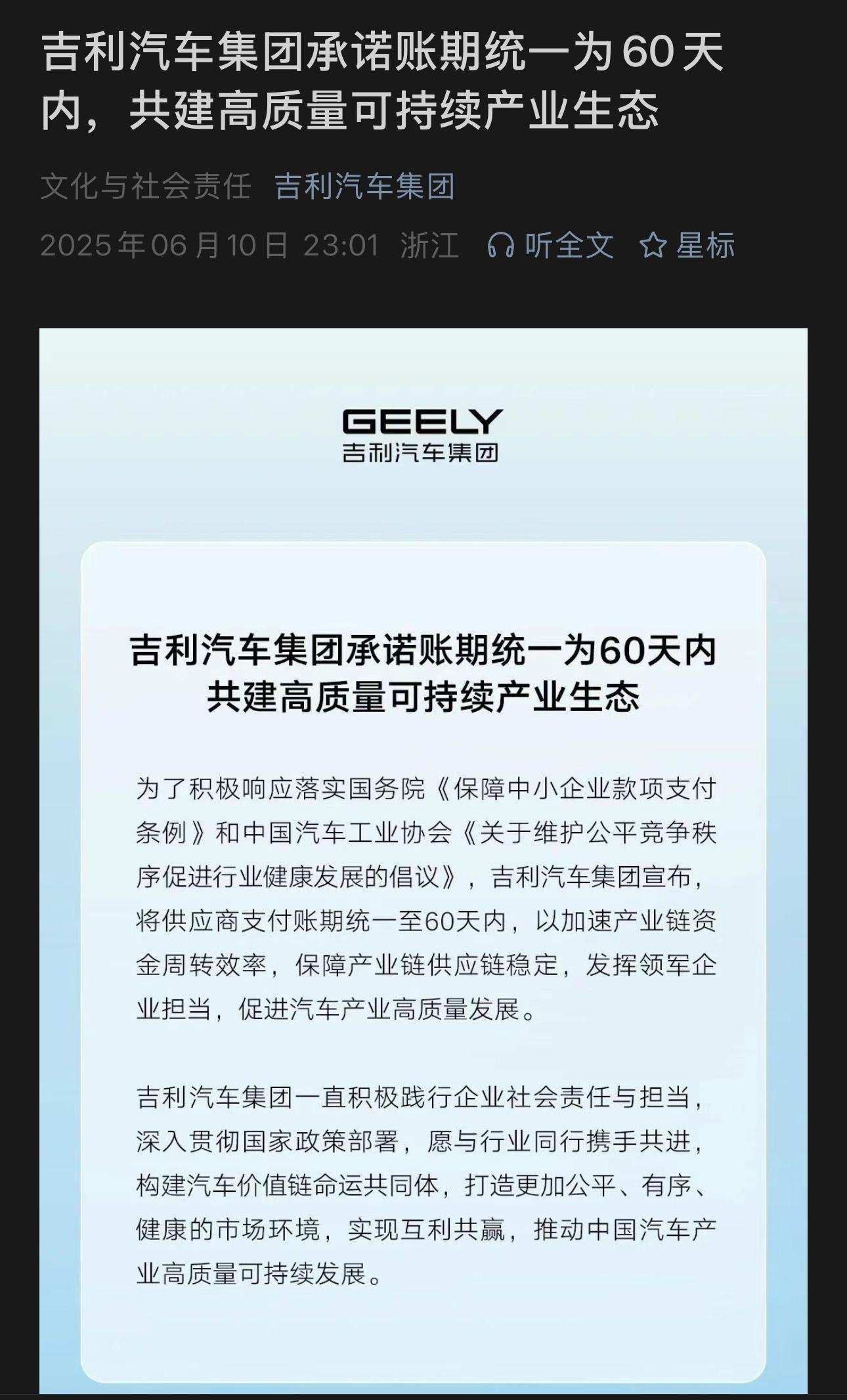 2025年6月10日,多家中国主流汽车企业集体承诺『供应商账期统一为60天内』。