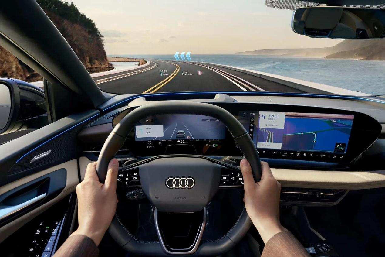 而在奥迪Q6L e-tron的座舱中,我看到一套整体性极强的设计。14.5英寸中控屏与11.9英寸仪表盘通过一块黑色饰板相连,下方的空调控制区则采用了悬浮式触控面板,整个中控台向驾驶员倾斜15度,使得操作区域可在指尖可达的范围。当人坐进驾驶座,视线不需要大幅移动就能同时观察仪表盘、中控屏和 88英寸的AR-HUD,这种『以驾驶员为中心』的布局,显然更符合我对豪华人机工程学设计的理解。