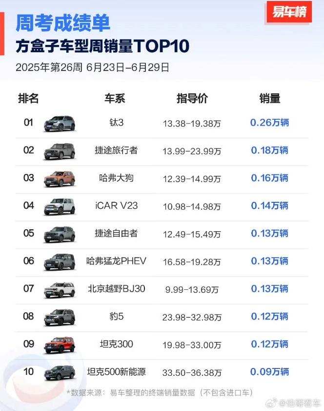 值得一提的是,6月第四周,钛3销量为2600辆,位列方盒子车型周销量TOP1。