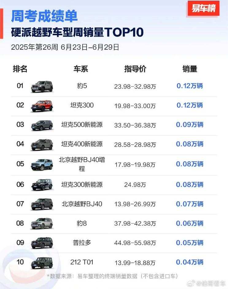 在6月第四周,豹5销量为1200辆,摘得硬派越野车型周销量桂冠。