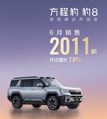 与此同时,方程豹豹5延续电驱越野领域开创引领的    王者风范,用绝对实力巩固统治地位。整月销量4875,同比增长81.9%,在竞争激烈的市场中,豹5始终保持着强大的产品竞争力。自上市以来,豹5凭借硬核越野性能与城野兼得的差异化优势,持续领跑硬派越野赛道。在搭载了高阶智能驾驶辅助系统后,更是补足了智驾板块,进化为全能全优的智能硬派。豹5靠着优秀的产品力,夯实了“电驱越野领导者”的标杆形象。